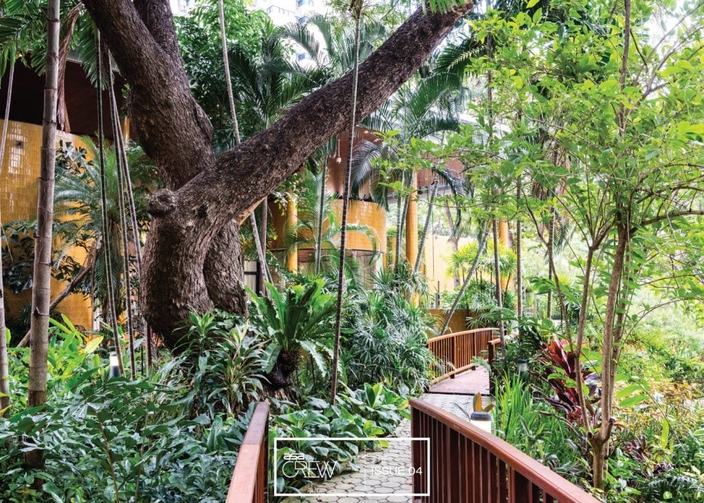 ในบทบาทของสถาปนิก Mr.Ken Woolley ได้เข้ามาดูพื้นที่ และพบว่าบริเวณของถนนสาทรเมื่อ 38 ปีก่อนนั้นมีปัญหาน้ำท่วมเป็นประจำทุกปีหากแก้ปัญหาด้วยการถมที่ดินลงไปจะทำให้ที่ดินรอดจากการถูกน้ำท่วม แต่จะส่งผลกระทบน้ำท่วมไปยังที่อื่นแทน ระหว่างนั้นเอง Mr.Ken Woolley ได้ไปเยี่ยมชมวังสวนผักกาดร่วมกับหม่อมหลวงตรีทศยุทธ จึงนำแนวคิดไทยในการออกแบบ การใช้น้ำในภูมิสถาปัตยกรรมเพื่อสร้างเอกลักษณ์อันโดด เด่นให้กับสถานที่มาปรับใช้นอกจากช่วยเสริมความปลอดภัยให้กับสถานที่แล้วยังช่วยรองรับน้ำท่วมได้อีกด้วย