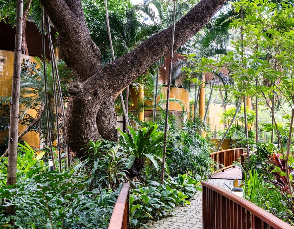 ในบทบาทของสถาปนิก Mr.Ken Woolley ได้เข้ามาดูพื้นที่ และพบว่าบริเวณของถนนสาทรเมื่อ 38 ปีก่อนนั้น มีปัญหาน้ำท่วมเป็นประจำทุกปี หากแก้ปัญหาด้วยการถมที่ดินลงไปจะทำให้ที่ดินรอดจากการถูกน้ำท่วม แต่จะส่งผล กระทบนำ้ท่วมไปยังที่อื่นแทน ระหว่างนั้นเอง Mr.Ken Woolley ได้ไปเยี่ยมชมวังสวนผักกาดร่วมกับหม่อมหลวงตรีทศยุทธ จึงนำแนวคิดไทยในการออกแบบ การใช้น้ำในภูมิสถาปัตยกรรมเพื่อสร้างเอกลักษณ์อันโดดเด่นให้กับสถานที่มาปรับใช้ นอกจากช่วยเสริมความปลอดภัยให้กับสถานที่แล้ว ยังช่วยรองรับนำ้ท่วมได้อีกด้วย