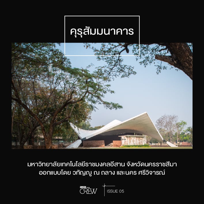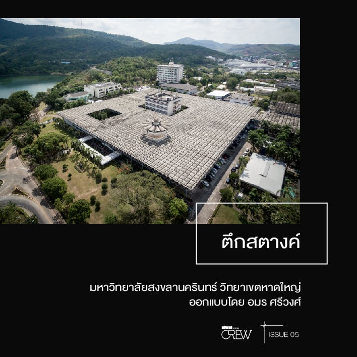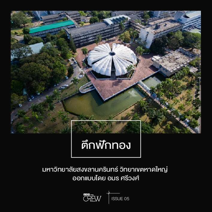 “จุดเริ่มต้นของที่นี่คล้ายๆ กับตึกฟักทองที่หาดใหญ่ เป็นยุคที่มีการสร้างแคมปัสตามหัวเมืองใหญ่ ในยุคนี้สถาปนิกนิยมออกแบบอาคารแบบไฮเปอร์โบลิกพาราโบลอยด์ (Hyperbolic Paraboliod) ซึ่งเล่นกับความโค้งของโครงสร้าง ถ้ามองแปลนของอาคารจะเห็นเป็นรูปหกเหลี่ยม แล้วยกมุมสามมุม กดอีกสามมุมลงเป็นพื้นที่ใต้หลังคา ซึ่งใช้คอนกรีตแผ่นเดียวความหนาประมาณ 10-15 เซนติเมตร ซึ่งถือว่าล้ำสมัยมาก ทราบมาว่าอาจารย์วทัญญูกับอาจารย์นครให้นักศึกษาช่วยกันเทคอนกรีต ซึ่งก็เหมือนเป็นการทำงานจริงไปด้วย เท่าที่ฟังมาด้วยความล้ำของรูปทรงอาคาร ทำให้มีคนไม่มั่นใจว่าตัวอาคารจะมั่นคงแข็งแรงจริงหรือ ดังนั้น เมื่อปูนแห้งแล้ว อาจารย์ก็ให้นักศึกษาขึ้นไปทดสอบยืนบนโครงสร้างด้านบน ปรากฏว่ายืนได้ ข้างหลังภาพนี้คือผมใช้เวลารอแสงนานมาก ระหว่างที่รอทำให้ผมได้เห็นคุณสมบัติของอาคารที่คำนึงถึงแรงลม อาคารนี้อยู่แล้วเย็น”