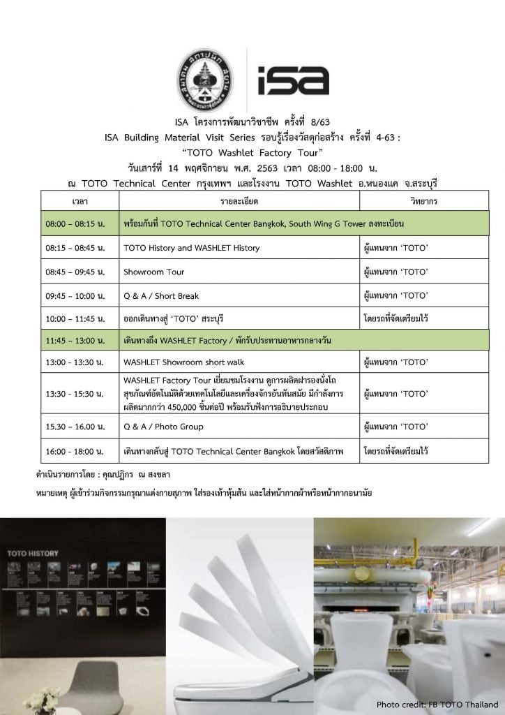 14 พ.ย. 63 | ISA โครงการพัฒนาวิชาชีพ ครั้งที่ 8/63 “TOTO Washlet Factory Tour” + Add to Google Calendar + iCal / Outlook export Date Nov 14 2020 Expired! Time All Day More Info ลงทะเบียน Category Material Info Visit Share this event