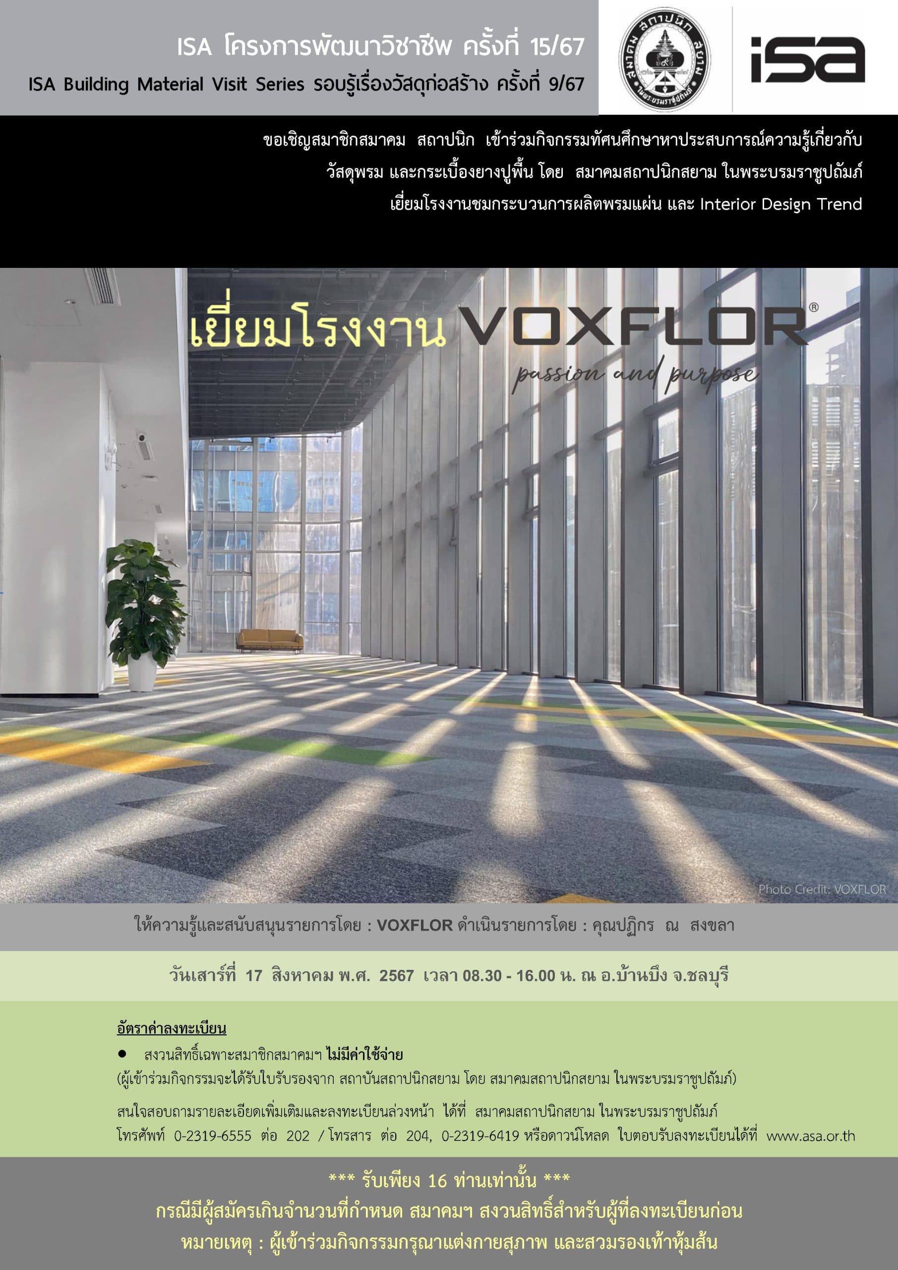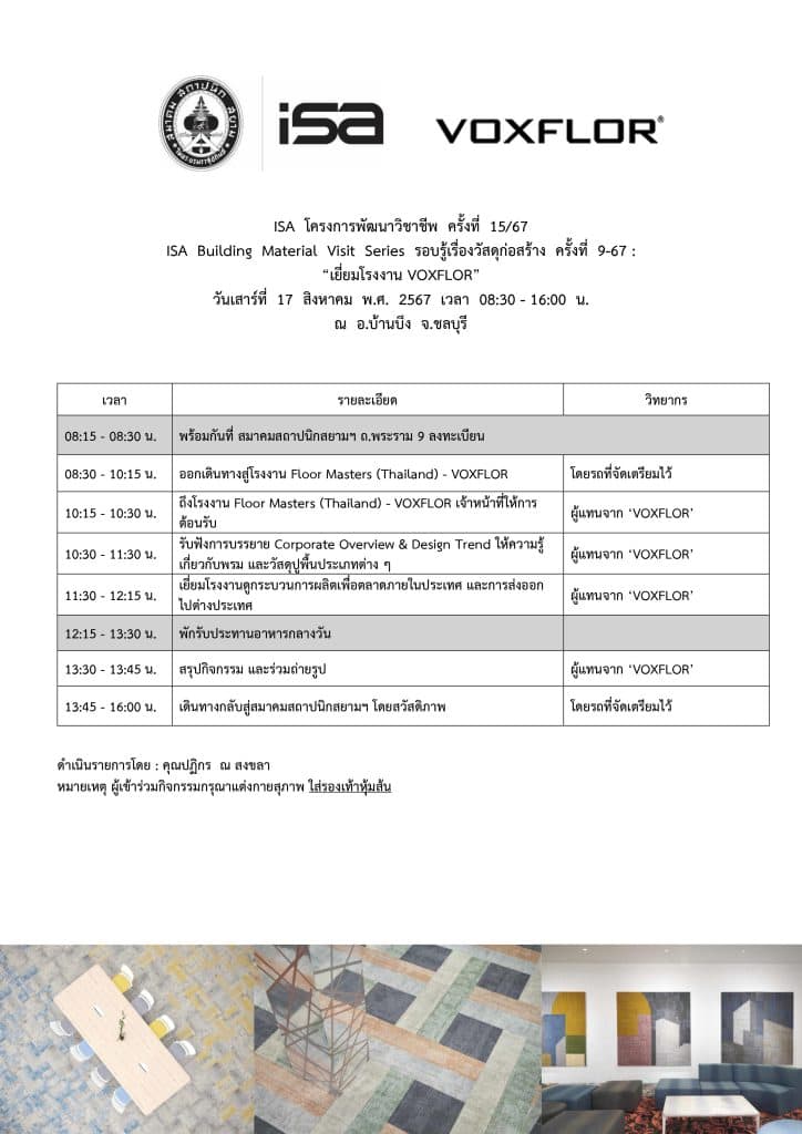 ISA โครงการพัฒนาวิชาชีพ ครั้งที่ 15/67 : เยี่ยมโรงงาน VOXFLOR ปิดรับลงทะเบียน เนื่องจากผู้สมัครเต็มจำนวน + Add to Google Calendar + iCal / Outlook export Date Aug 17 2024 Expired! Time 08:30 - 16:00 Category Material Info Visit Share this event