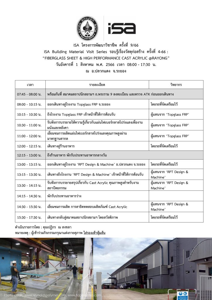 ISA โครงการพัฒนาวิชาชีพ ครั้งที่ 9/66 “FIBERGLASS SHEET & HIGH PERFORMANCE CAST ACRYLIC @RAYONG”
