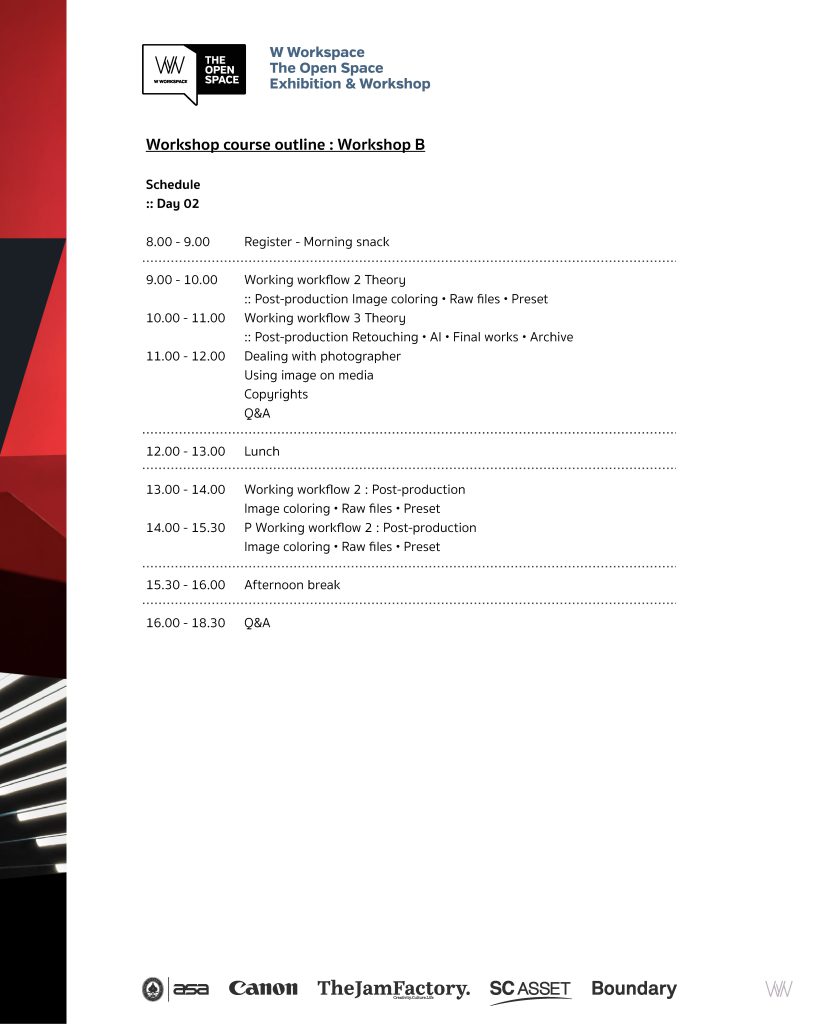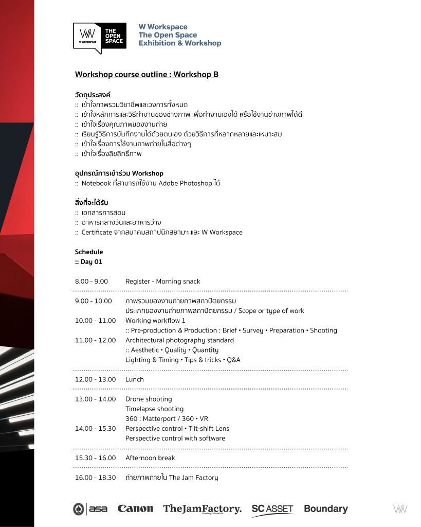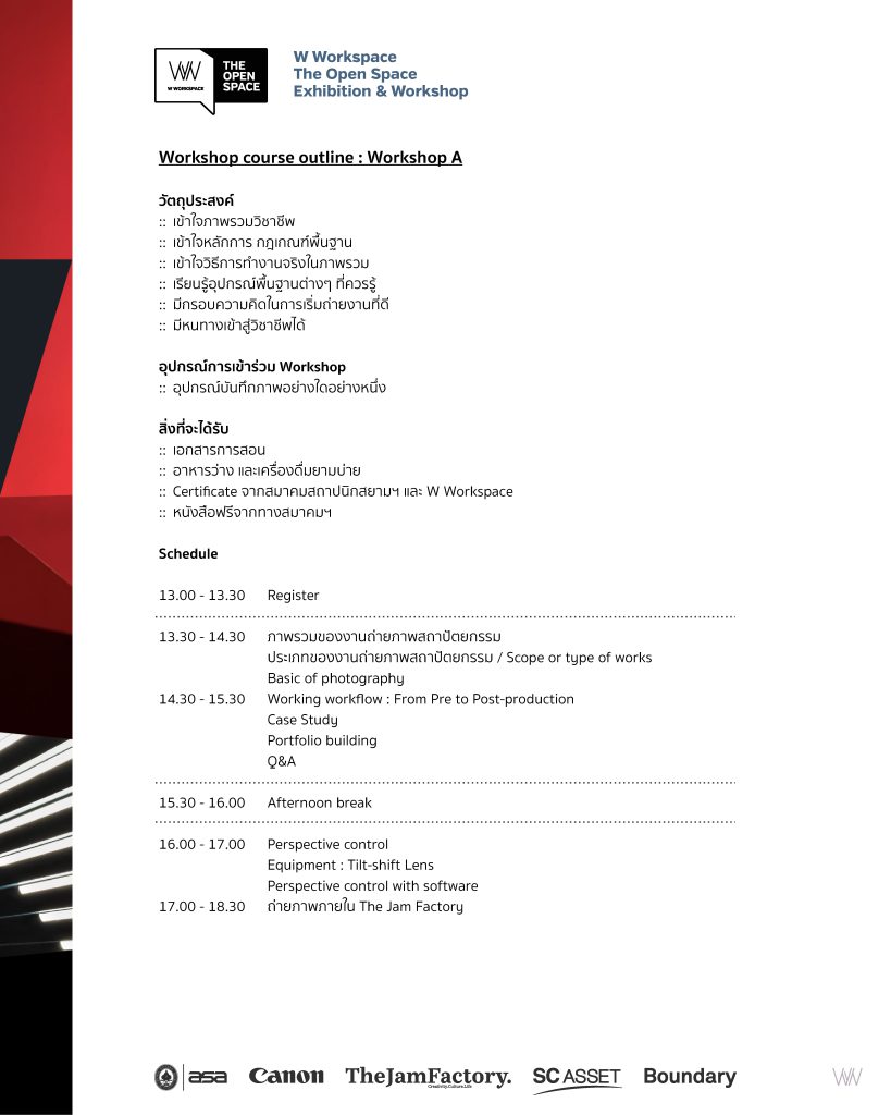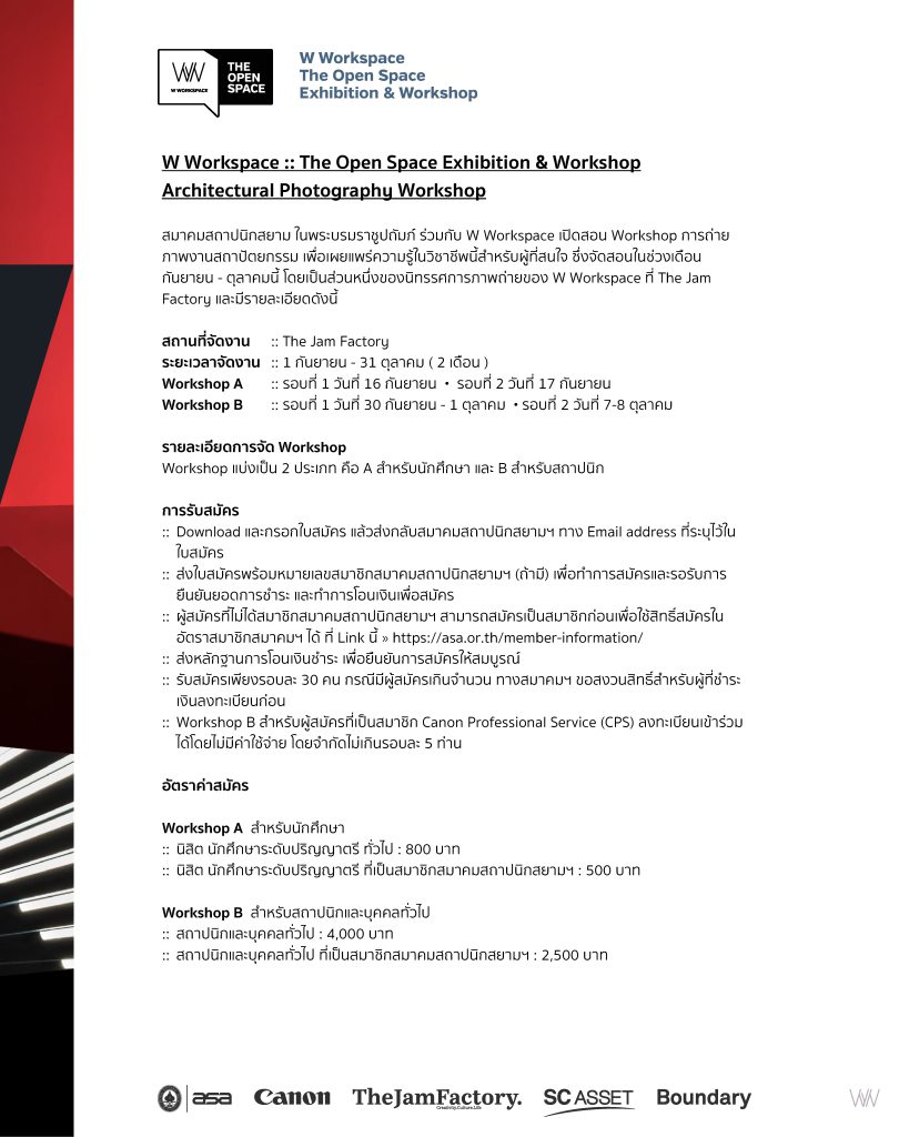 ** Workshop B การถ่ายภาพงานสถาปัตยกรรม สำหรับสถาปนิกและบุคคลทั่วไป รอบ 1 วันที่ 30 กันยายน – 1 ตุลาคม และ รอบ 2 วันที่ 7-8 ตุลาคม ยังเปิดรับปกติ