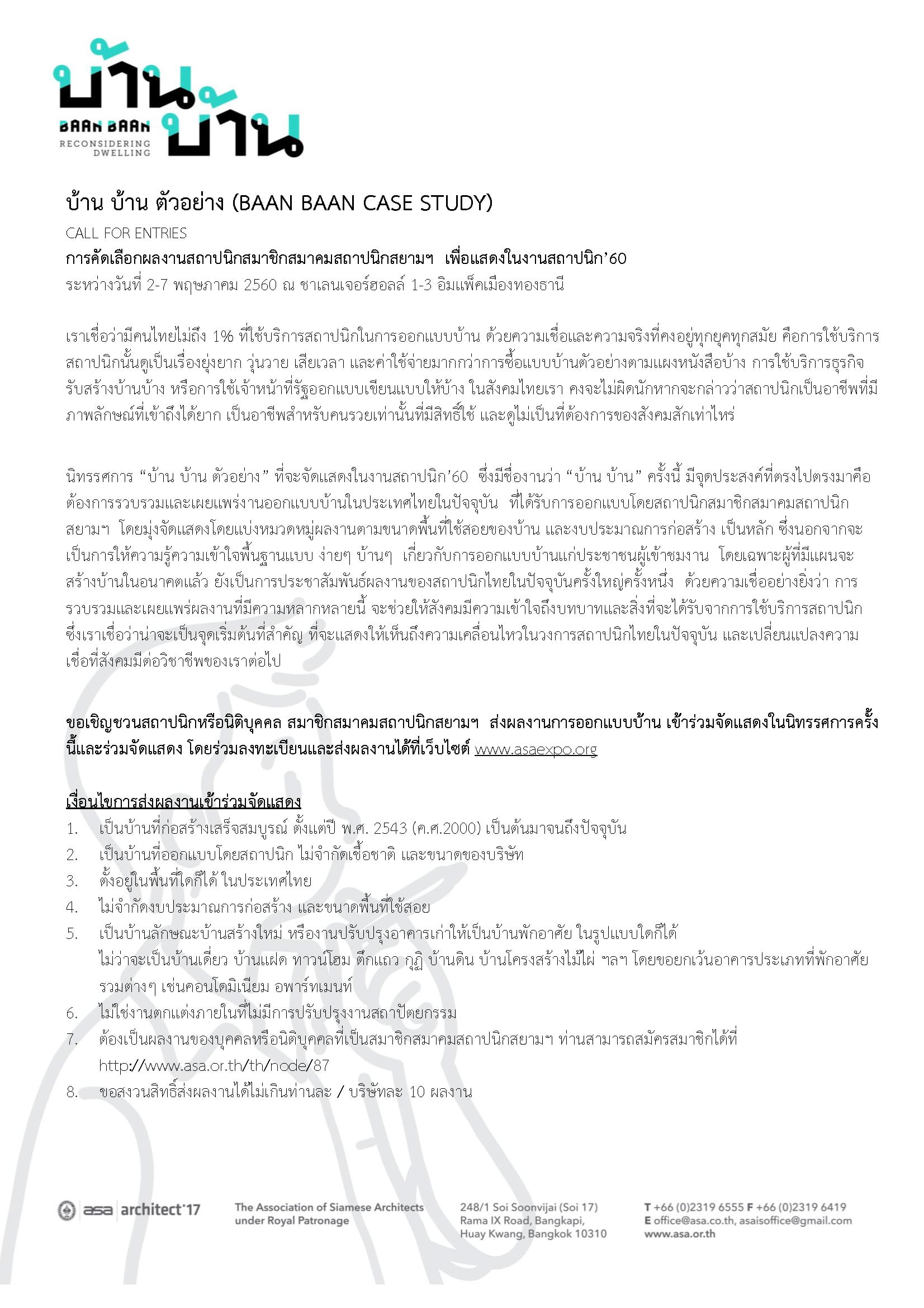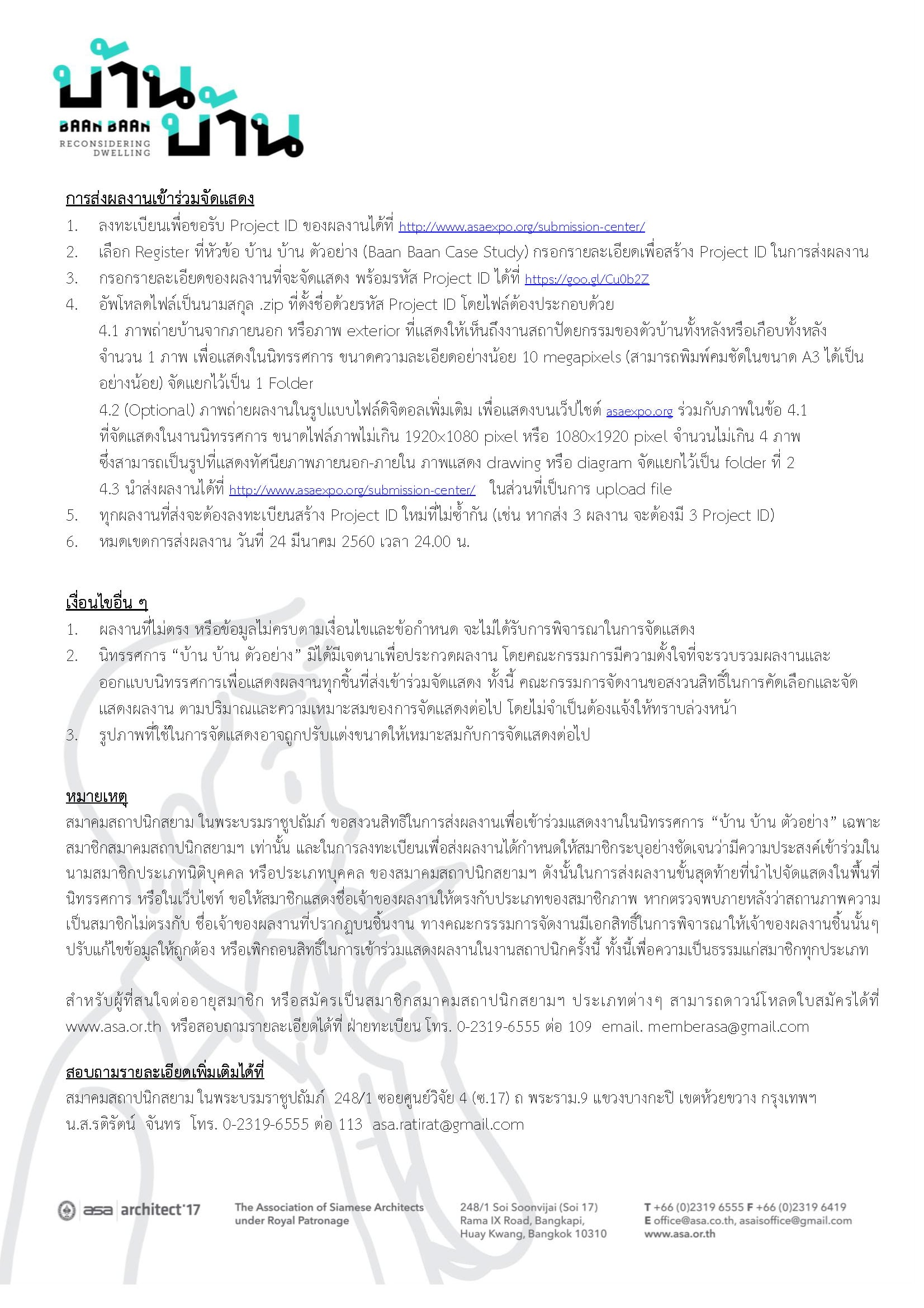 และสอบถามข้อมูลเพิ่มเติมได้ที่ สมาคมสถาปนิกสยาม ในพระบรมราชูปถัมภ์ คุณรติรัตน์ จันทร