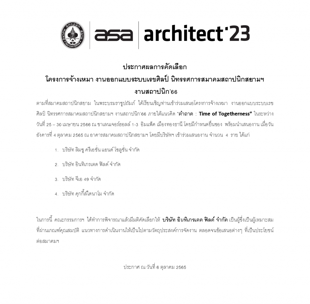 ประกาศผลคัดเลือกโครงการจ้างเหมา งานออกแบบระบบเรขศิลป์ นิทรรศการสมาคมสถาปนิกสยามฯ งานสถาปนิก’66