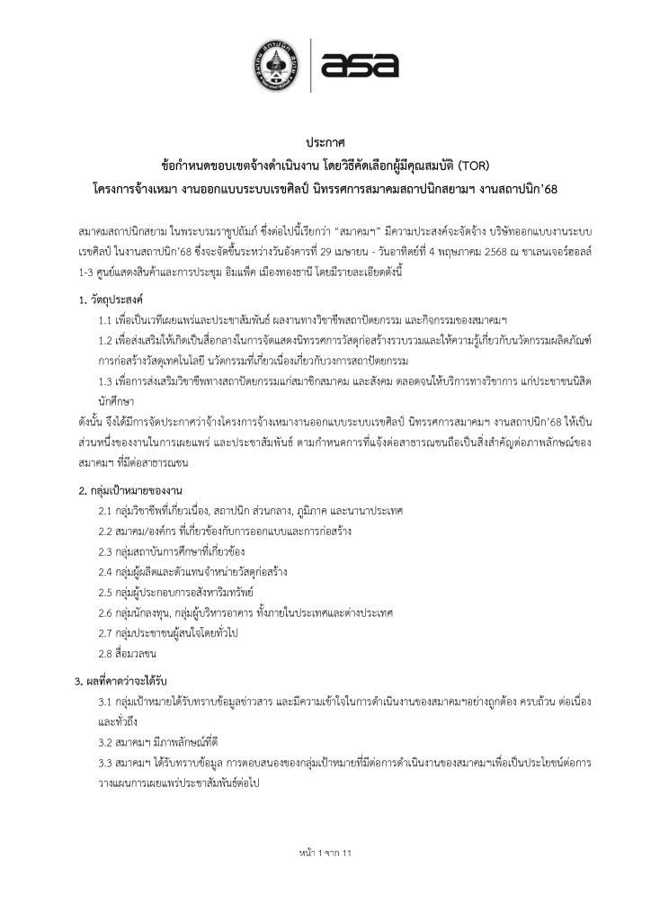 ประกาศจัดจ้าง โครงการจ้างเหมา งานออกแบบระบบเรขศิลป์ นิทรรศการสมาคมสถาปนิกสยามฯ งานสถาปนิก’68