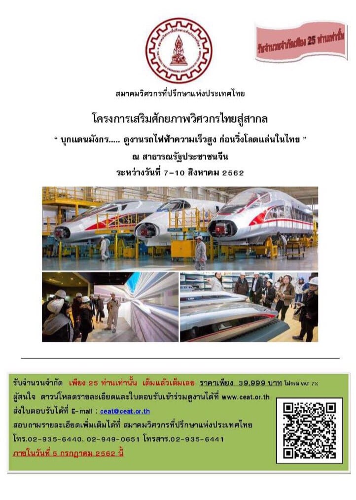 “บุกแดนมังกร…ดูงานรถไฟฟ้าความเร็วสูง ก่อนวิ่งโลดแล่นในไทย” ณ สาธารณรัฐประชาชนจีน ระหว่างวันที่ 7-10 สิงหาคม 2562