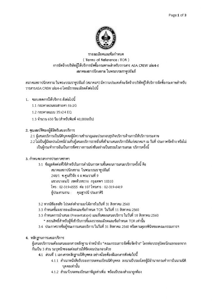 ประกาศจัดจ้างบริษัทผู้ให้บริการจัดซื้อกระดาษสาหรับวารสาร ASA CREW เล่ม4-6 สมาคมสถาปนิกสยาม ในพระบรมราชูปถัมภ์