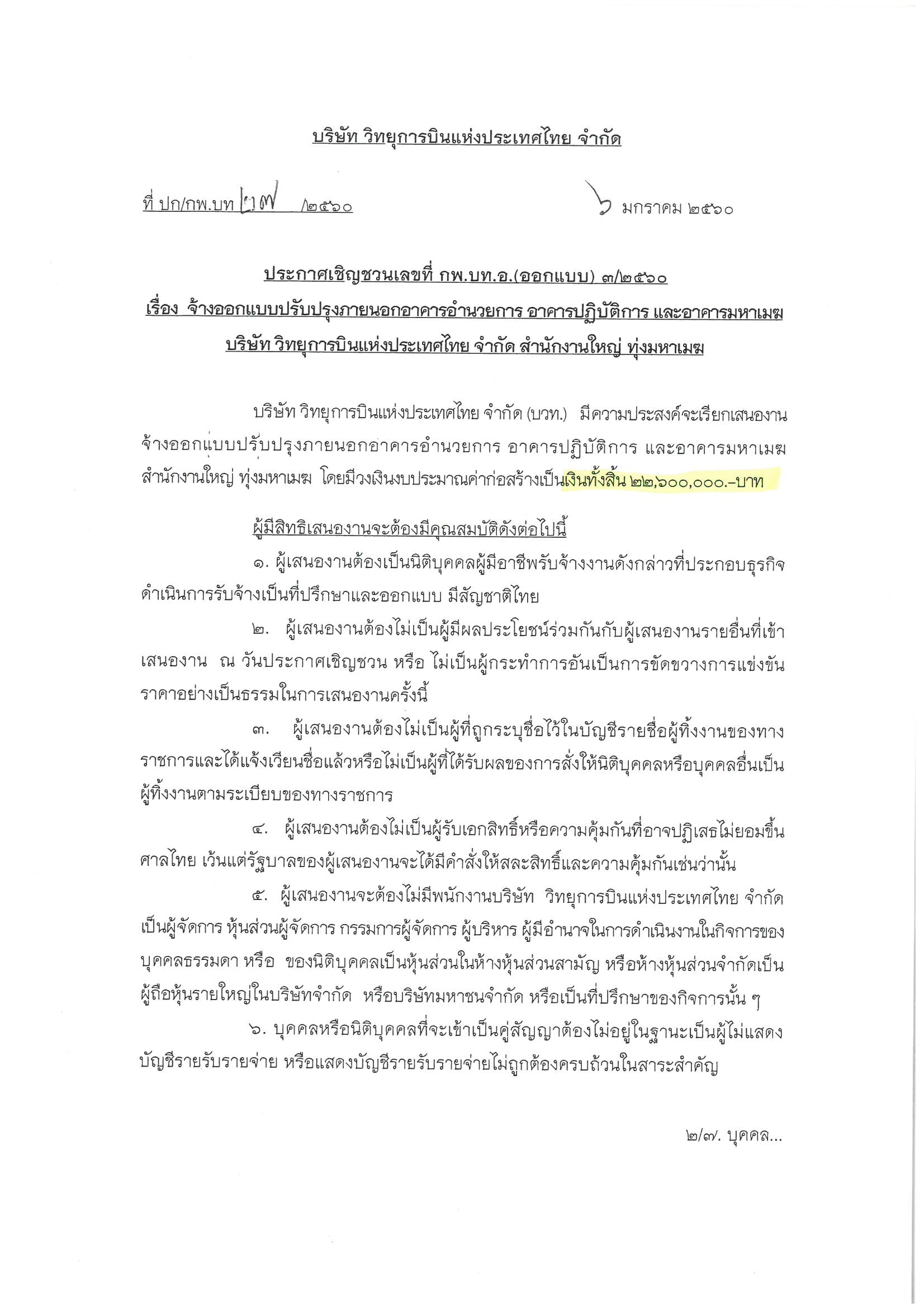 ประกาศ จ้างออกแบบปรับปรุงภายนอกอาคารอำนวยการ อาคารปฏิบัติการ และอาคารมหาเมฆ บริษัท วิทยุการบินแห่งประเทศไทย จำกัด สำนักงานใหญ่ ทุ่งมหาเมฆ