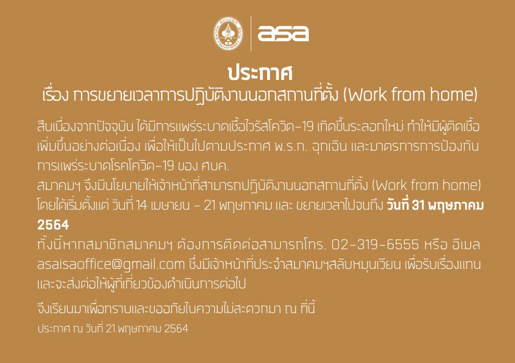 ประกาศ เรื่อง ขยายเวลาการปฏิบัติงานนอกสถานที่ตั้ง (WORK FROM HOME)