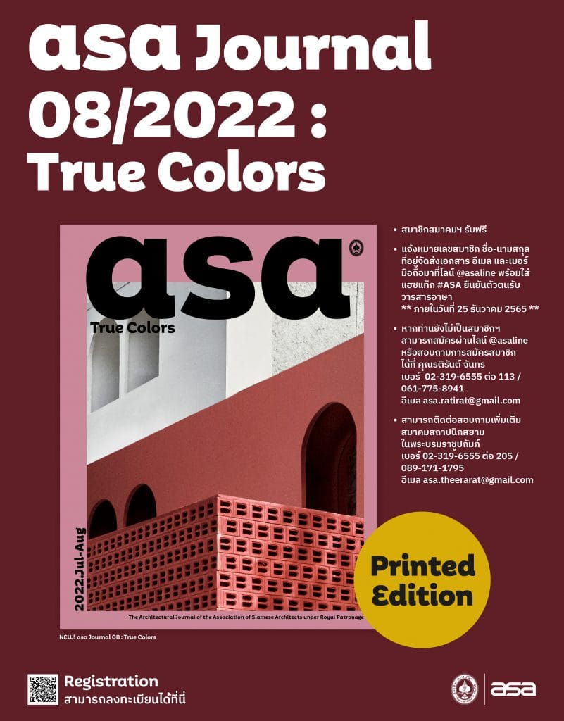 ASA Journal08/2022 : True ColorsPrinted Editionsพิเศษ! สำหรับสมาชิกสมาคมสถาปนิกสยาม ในพระบรมราชูปถัมภ์ที่ประสงค์จะรับวารสารอาษา : True Colors ฉ.08/2022 (ก.ค.-ส.ค.65) ในรูปเล่ม Printed Editionsโปรดยืนยันตัวตน ! โดยแจ้ง หมายเลขสมาชิก ชื่อ-นามสกุล ที่อยู่จัดส่งเอกสาร อีเมล และเบอร์มือถือ มาที่ไลน์ @asaline พร้อมใส่แฮชแท็ก #ASAยืนยันตัวตนรับวารสารอาษา** หากท่านที่เคยแจ้งรับฉบับที่ผ่านมาแล้ว เพียงแค่พิมพ์ #ASAยืนยันตัวตนรับวารสารอาษาเล่ม08** ภายในวันที่ 25 ธันวาคม 2565 **อ่านฉบับออนไลน์และดาวน์โหลดได้ที่ https://uat.asa.or.th/journal/asa-journal-08-2022/สอบถามข้อมูลการสมัครสมาชิกเพิ่มเติม (Tel.) 02-319-6555 ต่อ 113 / 061-775-8941 คุณรติรัตน์ จันทร (Email) [email protected], Line ID @asaline_#ASAMember #ASAJournal #ASAPlatform#turecolors #printedition