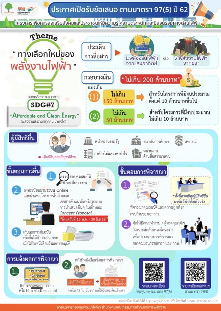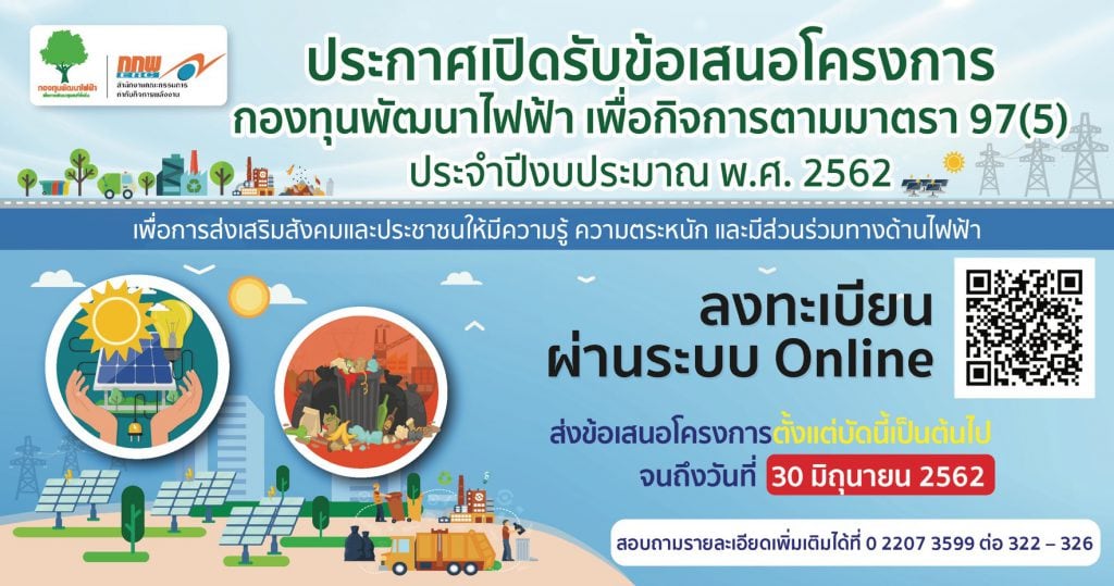 คณะกรรมการกำกับกิจการพลังงาน (กกพ.) เปิดรับโครงการเพื่อการส่งเสริมสังคมและประชาชนให้มีความรู้ ความตระหนัก และมีส่วนร่วมทางด้านไฟฟ้า จากการจัดสรรเงินกองทุนพัฒนาไฟฟ้า (ตามมาตรา 97(5)