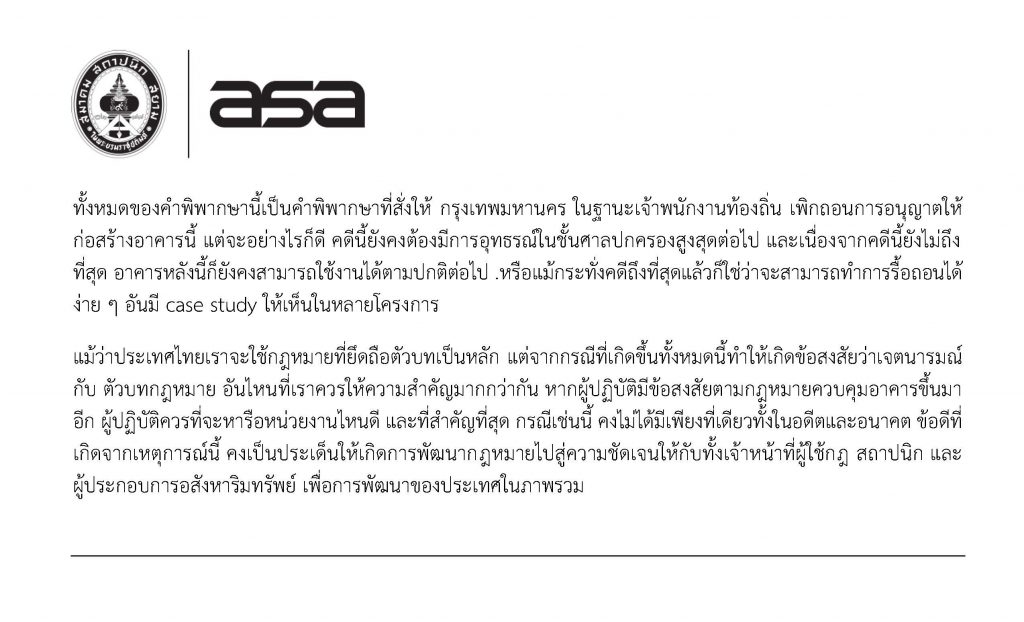 สมาคมสถาปนิกสยาม ในพระบรมราชูปถัมภ์ ได้ติดตามข่าวสารเรื่อง แอชตัน อโศก มาตั้งแต่เริ่มมีการร้องเรียน จนถึงปัจจุบันศาลปกครองกลางได้มีคำพิพากษาให้ กรุงเทพมหานคร ในฐานะเจ้าพนักงานท้องถิ่น “เพิกถอนใบรับหนังสือแจ้งความประสงค์จะก่อสร้าง ดัดแปลง รื้อถอน หรือเคลื่อนย้ายอาคาร หรือเปลี่ยนแปลงการใช้อาคาร โดยไม่ยื่นคำขอรับใบอนุญาต ตามมาตรา 39 ทวิ โดยให้มีผลย้อนหลังไปถึงวันที่ออกหนังสือ ส่วนคำขออื่นนอกจากนี้ให้ยก” โดยคำพิพากษานี่แม้จะยังต้องอุทธรณ์คำพิพากษาในชั้นศาลปกครองสูงสุดแต่ก็มีความสำคัญและเป็นที่สนใจของผู้ประกอบวิชาชีพสถาปนิกหลายท่าน สมาคม ฯ จึงได้คัดกรองประเด็นที่น่าสนใจในคดีนี้ที่หลาย ๆ สื่อมิได้นำเสนอข้อเท็จจริงในส่วนนี้เพื่อทำการเผยแพร่ให้สมาชิกและผู้สนใจทุกท่านได้ใช้เป็นกรณีศึกษาดังนี้