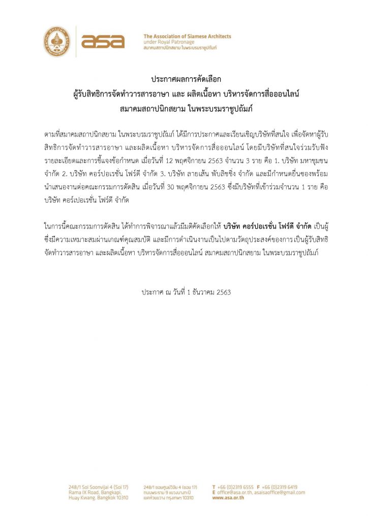 Home » News » ประกาศผลการคัดเลือกผู้รับสิทธิการจัดทำวารสารอาษา และ ผลิตเนื้อหา บริหารจัดการสื่อออนไลน์