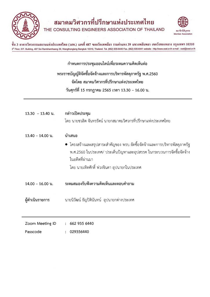 ขอเรียนเชิญสมาชิกสมาคมฯ ส่งประเด็นคำถามเพื่อให้สมาคมสถาปนิกสยามฯ ร่วมแสดงความคิดเห็นต่อ พ.ร.บ จัดซื้อจัดจ้าง พ.ศ. 2560 โดย สมาคมวิศวกรที่ปรึกษา แห่งประเทศไทย จะจัดประชุม ในวันศุกร์ที่ 15 กรกฎาคม 2565