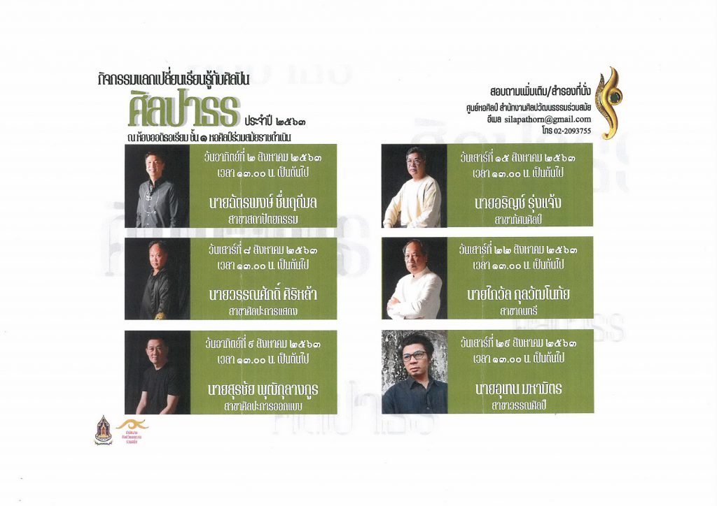 ติดตามชมเสวนาและนิทรรศการผลงานศิลปินศิลปาธร ผู้ทรงไว้ซึ่งศิลปะ ได้ทางแฟนเพจ Facebook และ Youtube สำนักงานศิลปวัฒนธรรมร่วมสมัย กระทรวงวัฒนธรรม