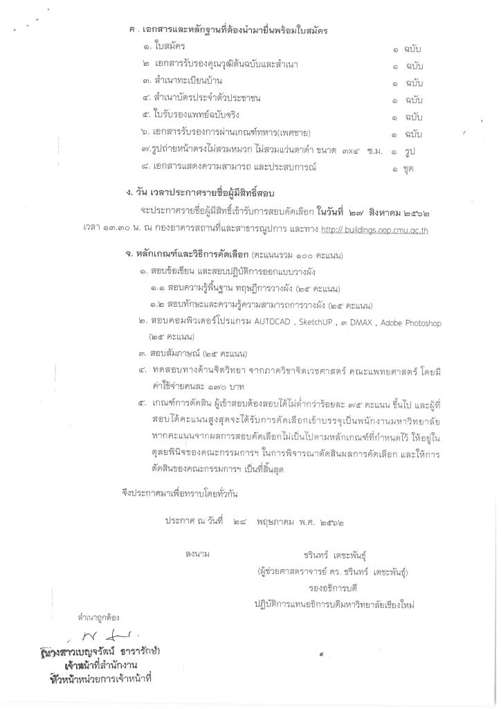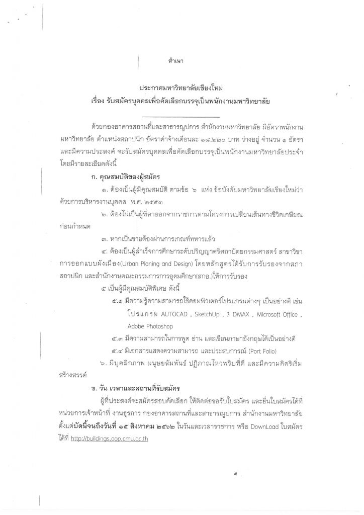 ประชาสัมพันธ์การรับสมัครบุคคลเพื่อคัดเลือกบรรจุเป็นพนักงานมหาวิทยาลัย ตำแหน่ง สถาปนิก สาขาวิชา การออกแบบผังเมือง (Urban Design) อัตราค่าจ้างเดือนละ 18,220.-บาท จำนวน 1 อัตรา ผู้สนใจสามารถติดต่อรับใบสมัครได้ที่ หน่วยการเจ้าหน้าที่ งานธุรการ กองอาคารสถานที่และสาธารณูปการ สำนักงานมหาวิทยาลัย หรือ Download ใบสมัครได้ที่ http://buildings.oop.cmu.ac.th ตั้งแต่บัดนี้จนถึงวันที่ 15 สิงหาคม 2562 (รายละเอียดตามเอกสารไฟล์แนบ)