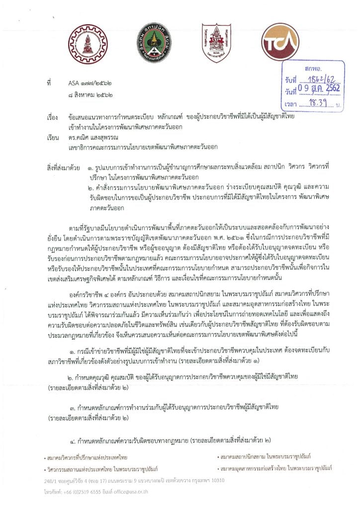 เมื่อวันที่ 17 กุมภาพันธ์ 2563 ที่ผ่านมา สมาคมสถาปนิกสยาม ในพระบรมราชูปถัมภ์ ได้เข้าพบคณะกรรมการนโยบายพัฒนาเขตเศรษฐกิจพิเศษภาคตะวันออก (EEC) ที่ อาคาร CAT TOWER ถนนเจริญกรุง เขตบางรัก ผ่านการประสานงานจากกระทรวงมหาดไทย เพื่อหารือปัญหาผลกระทบจาก พระราชบัญญัติ เขตพัฒนาพิเศษภาคตะวันออก พ.ศ. 2561 มาตรา 59 และ มาตรา 59 (1) ซึ่งถือเป็นการให้สิทธิสภาพนอกอาณาเขตแก่สถาปนิกและวิศวกรต่างชาติ โดยสมาคมฯ ได้ขอให้ทางรัฐบาลทบทวนปรับแก้ไขใหม่ให้สอดคล้องกับ พ.ร.บ.สถาปนิก พ.ศ. 2543 และ พ.ร.บ.วิศวกร พ.ศ. 2542 อีกทั้งรัฐควรเน้นส่งเสริมการเพิ่มประสิทธิภาพการทำงานของหน่วยงานต่างๆภาครัฐให้บูรณาการในรูปแบบของ One Stop Service…