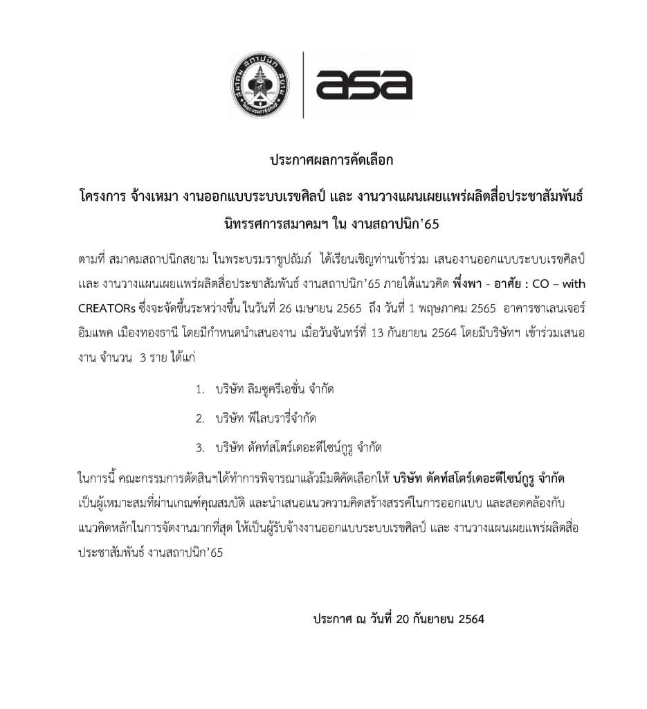 ประกาศผลการคัดเลือก โครงการ จ้างเหมา งานออกแบบระบบเรขศิลป์ เเละ งานวางแผนเผยเเพร่ผลิตสื่อประชาสัมพันธ์ นิทรรศการสมาคมฯ ใน งานสถาปนิก’65