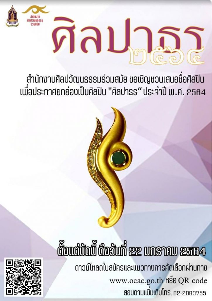 สำนักงานศิลปวัฒนธรรมร่วมสมัย กระทรวงวัฒนธรรม ขอเชิญบุคคล องค์กร หรือหน่วยงาน เสนอรายชื่อศิลปินเพื่อประกาศยกย่องเป็นศิลปินศิลปาธร ประจำปี พ.ศ. 2564 ตั้งแต่บัดนี้จนถึงวันที่ 22 มกราคม 2564 ดาว์โหลดแบบฟอร์มและคู่มือคัดเลือกที่ www.ocac.go.th สอบถามเพิ่มเติม โทร. 02 209 3755