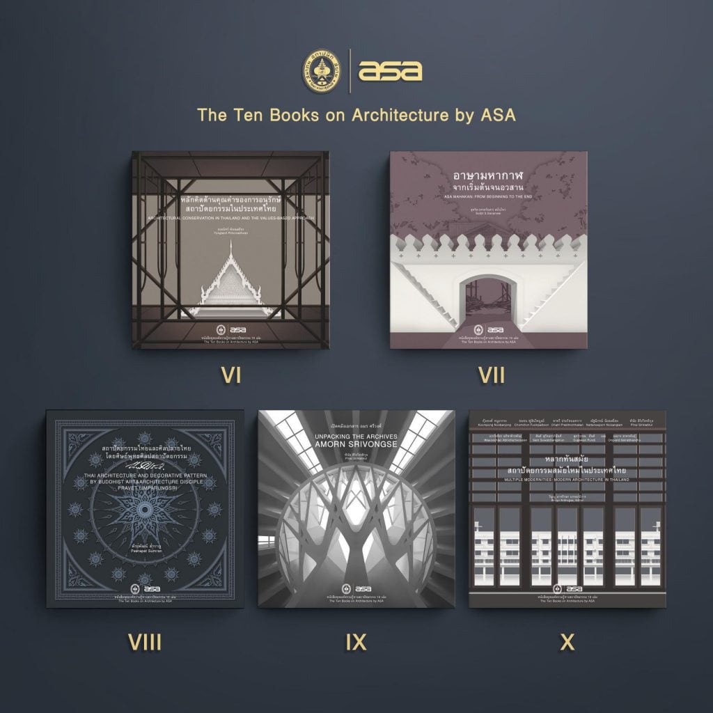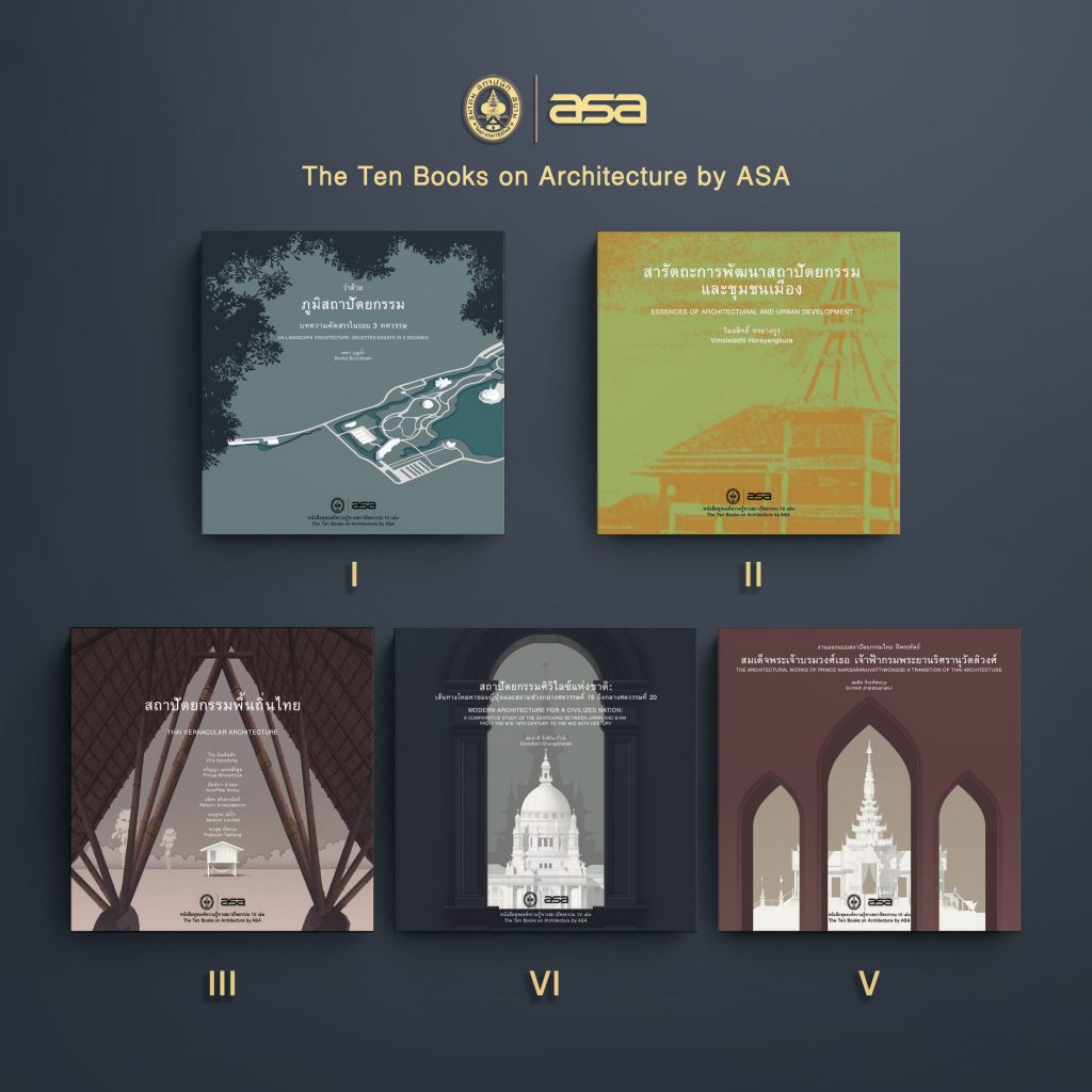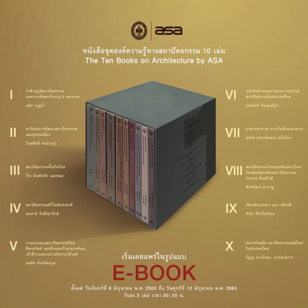 The Ten Books on Architecture by ASA ที่จัดทำขึ้นในรูปเล่มขนาด 10 นิ้ว x 10 นิ้วและเผยแพร่ในรูปแบบ e-book นี้ เป็นการรวบรวมผลงานการศึกษาสถาปัตยกรรมในสาขาวิชาต่าง ๆ ให้แก่ผู้ที่สนใจทั้งในและนอกวงการสถาปัตยกรรมได้อ่านและค้นคว้าอย่างแพร่หลายโดยไม่คิดมูลค่า ประกอบด้วยหนังสือทรงคุณค่าดังต่อไปนี้
