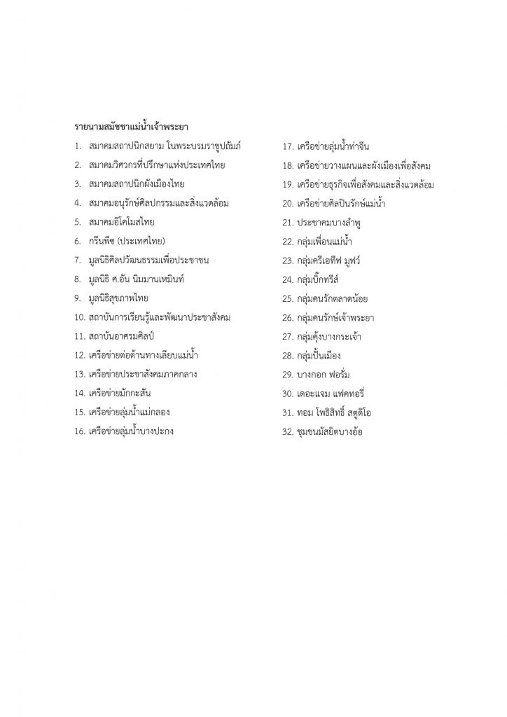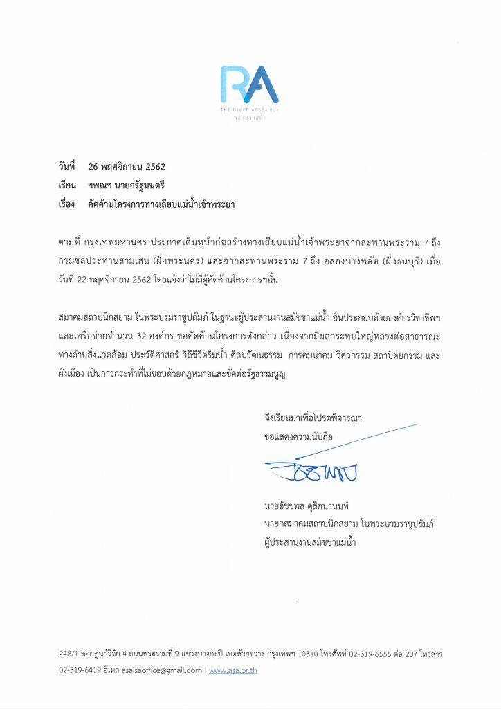 แถลงการณ์คัดค้านโครงการทางเลียบแม่น้ำเจ้าพระยา
