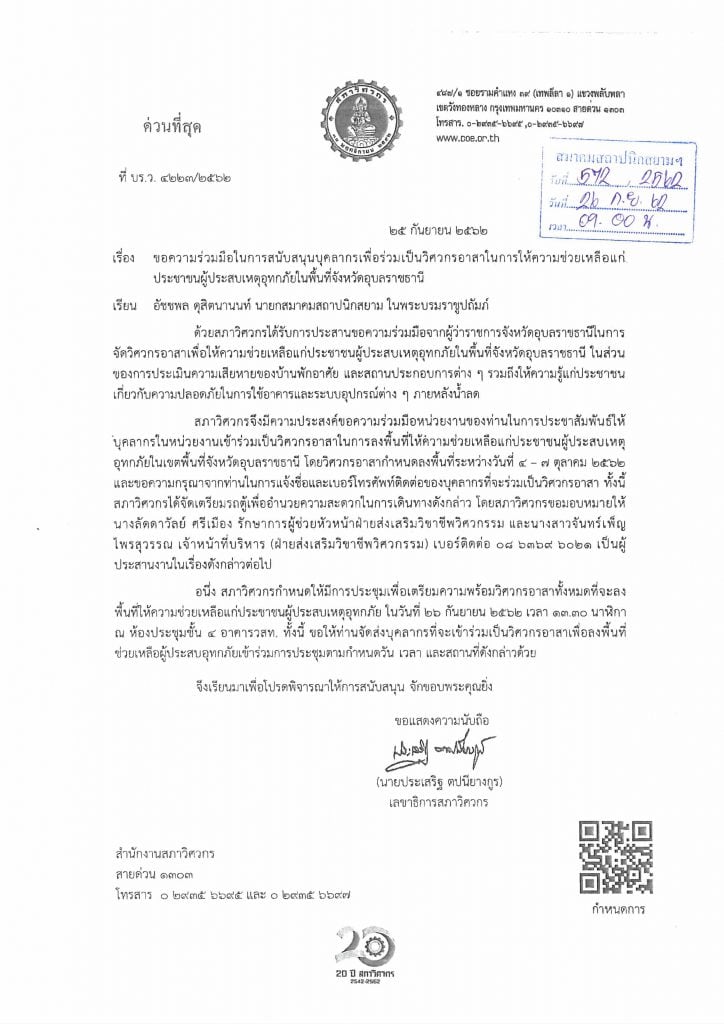 ตามที่สภาวิศกรได้ส่งเรื่องถึงสมาคมสถาปนิกสยาม ในพระบรมราชูปถัมภ์ เพื่อขอความร่วมมือบุคคลากรเพื่อร่วมเป็นวิศวกรอาสาในการช่วยเหลือผู้ประสบอุทกภัยในพื้นที่ จ.อุบลราชธานีนั้น