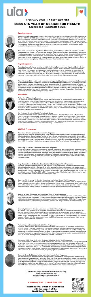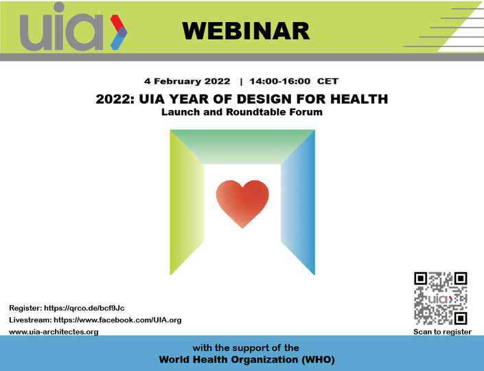 เชิญผู้สนใจร่วมฟัง Webinar: UIA Year of Design for Health ในวันที่ 4 กุมภาพันธ์ 2565 เวลา 20.00น. (เวลาในประเทศไทย) ผู้สนใจสามารถดูรายละเอียดเพิ่มเติมและลงทะเบียนได้ที่ https://www.uia-architectes.org/webApi/en/news/2022:-uia-year-of-design-for-health-launch.html