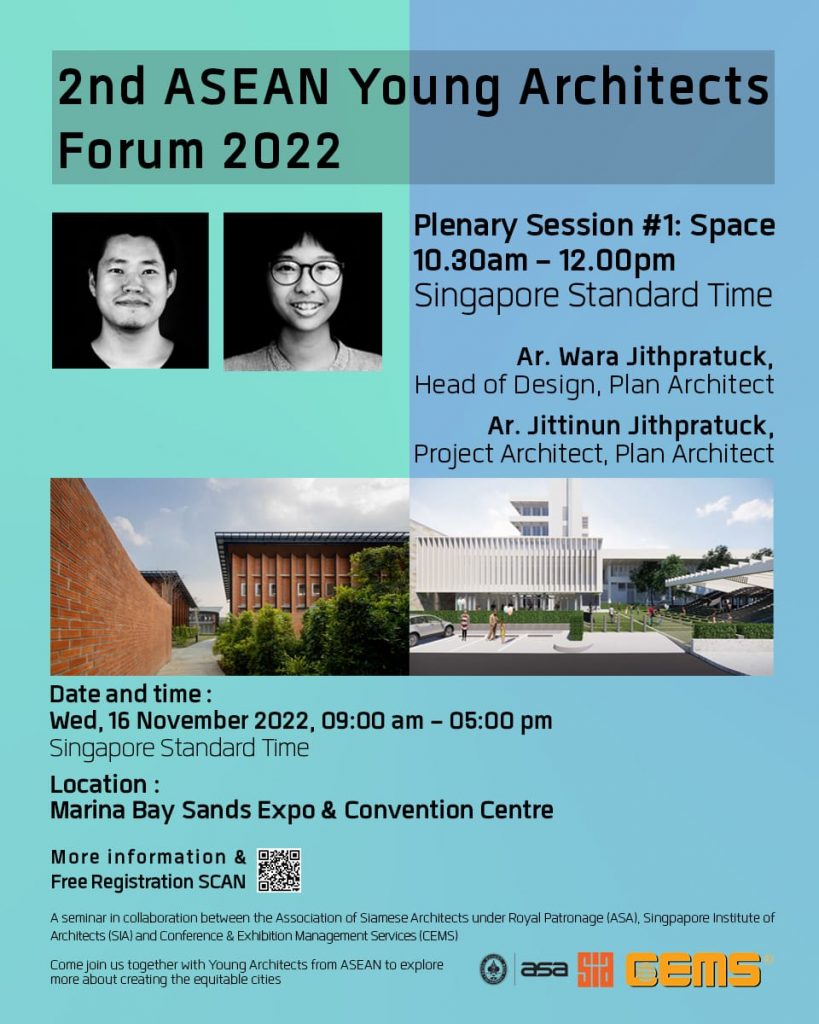ขอเชิญชวน ผู้สนใจเข้าร่วมฟังการสัมมนา 2nd ASEAN Young Architects Forum 2022 ในหัวข้อเรื่อง “Co-creating our Equitable Cities”  ในวันพุธที่ 16 พฤศจิกายน 2565 เวลา 09:00-17:00น. (เวลาประเทศสิงคโปร์) ณ Marina Bay Sands Expo & Convention Centre งานสัมมนาครั้งนี้ คุณวรา จิตรประทักษ์ และคุณจิตตินันท์ จิตรประทักษ์ สถาปนิก บริษัท แปลน อาคิเต็ค จำกัด และเหล่าสถาปนิกรุ่นใหม่ในอาเซียน ที่มีผลงานโดดเด่น มาแบ่งปันและเล่าถึงผลงานในประเด็นต่างๆเปิดลงทะเบียนตั้งแต่วันนี้ ถึง 16 พฤศจิกายน 2565 ผู้ที่สนใจเข้าร่วมฟังการสัมมนาสามารถสำรองที่นั่งโดยไม่เสียค่าใช้จ่ายได้ที่ https://www.eventbrite.com/e/2nd-asean-young-architects-forum-2022-tickets-438876109257
