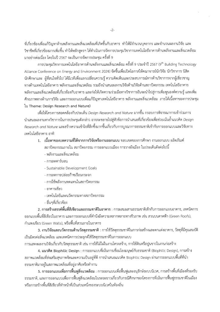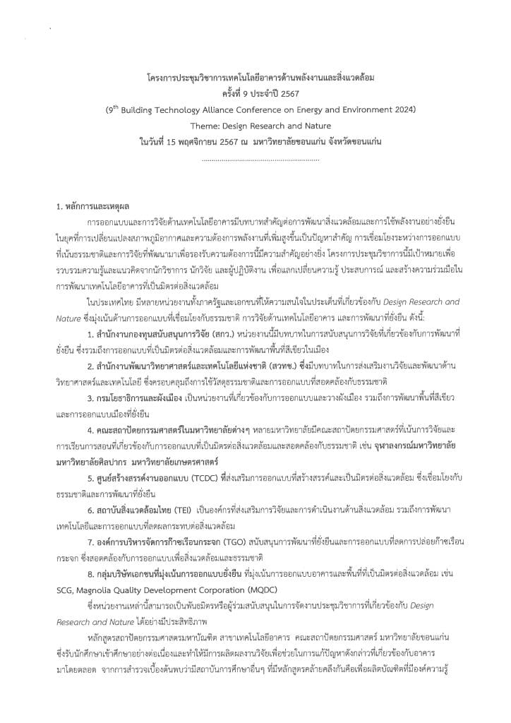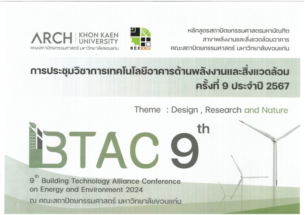ด้วย คณะสถาปัตยกรรมศาสตร์ มหาวิทยาลัยขอนแก่น จัดโครงการประชุมวิ ชาการเทคโนโลยีอาคารด้านพลั งงานและสิ่งแวดล้อม ครั้งที่ 9 ประจำปี 2567 (9th Building Technology Alliance Conference on Energy and Environment 2024) ในวันที่ 15 พ.ย. 2567 ณ ม.ขอนแก่น จ.ขอนแก่น ภายใต้เนื้อหา “Design Research and Nature” เพื่อเป็นเวทีนำเสนอผลงานทางวิชาการ จึงขอความอนุเคราะห์ประชาสัมพั นธ์การเปิดรับพิจารณาบทความด้ านสถาปัตยกรรม เทคโนโลยีอาคารพลังงานและสิ่งแวดล้อมที่เกี่ ยวข้องกับอาคาร
