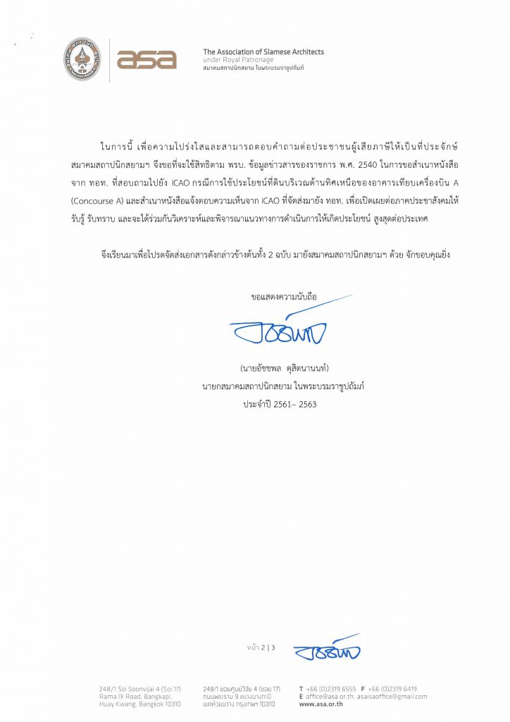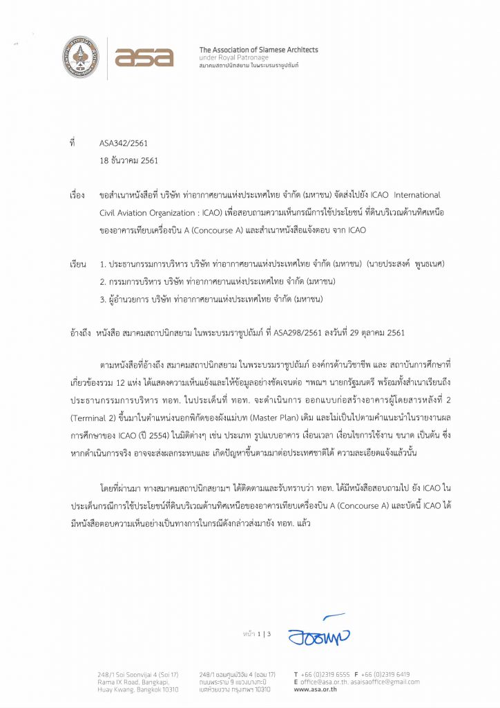 เมื่อวันที่ 18 ธันวาคม 2561 สมาคมสถาปนิกสยาม ในพระบรมราชูปถัมภ์ ได้ยื่นหนังสือ เพื่อขอสําเนาหนังสือที่ บริษัท ท่าอากาศยานแห่งประเทศไทย จํากัด (มหาชน) จัดส่งไปยัง ICAO International Civil Aviation Organization : ICAO) เพื่อสอบถามความเห็นกรณีการใช้ประโยชน์ ที่ดินบริเวณด้านทิศเหนือของอาคารเทียบเครื่องบิน A (Concourse A)