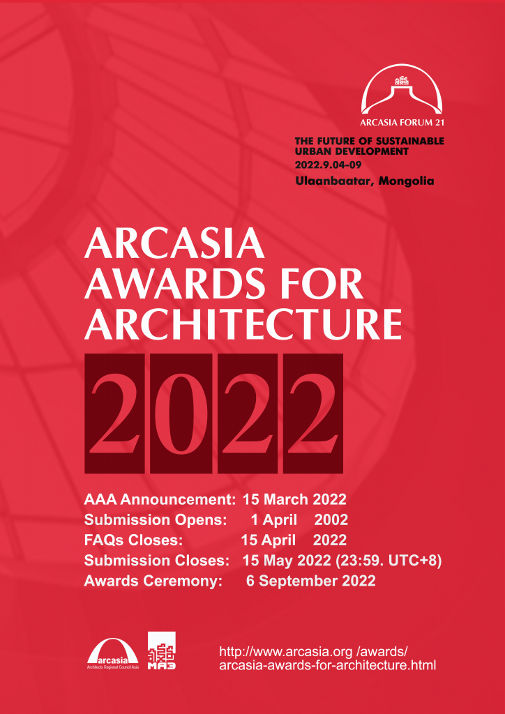 ขอเชิญสถาปนิกที่สนใจส่งผลงานประกวดโครงการ ARCASIA  AWARDS FOR ARCHITECTURE 2022 เปิดรับผลงานตั้งแต่วันที่ 1 เมษายน – 15 พฤษภาคม 2565 ทั้งนี้ สามารถดูรายละเอียดและดาวน์โหลดใบสมัครได้ที่  https://www.arcasia.org/awards/arcasia-awards-for-architecture.html และสอบถามรายละเอียดเพิ่มเติมได้ที่ arcasiaforum21mongolia@gmail.com