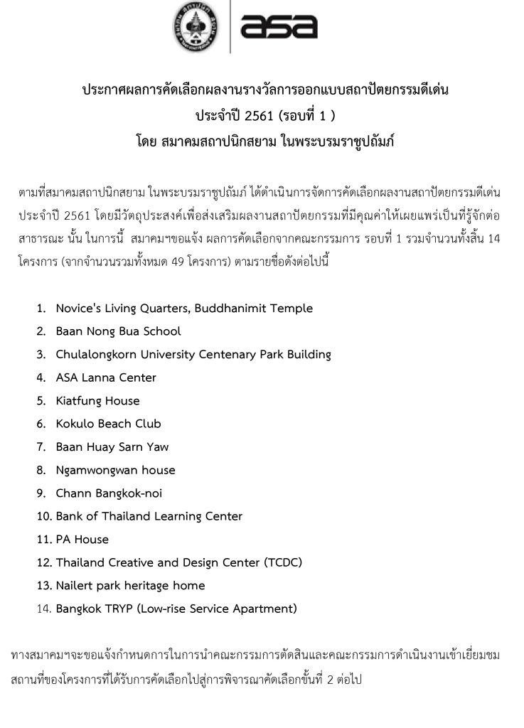 การประกาศผลการคัดเลือกรางวัลการออกแบบสถาปัตยกรรมดีเด่น รอบที่ 1