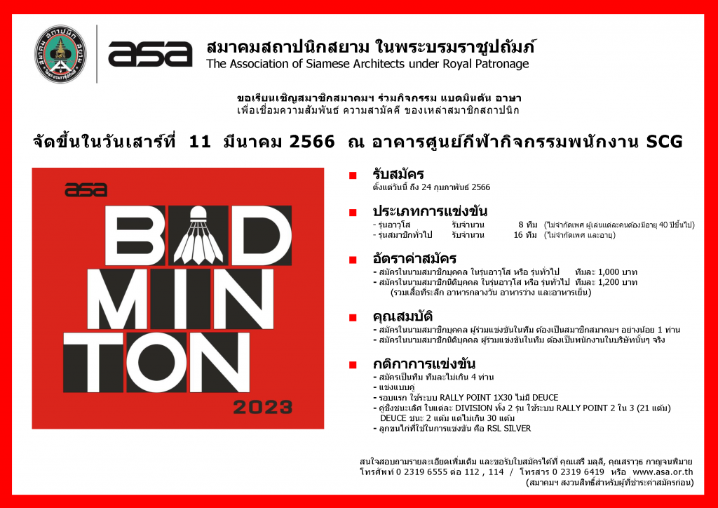 ขอเชิญชวนสมาชิกสมาคมฯ สถาปนิกและผู้สนใจร่วมกิจกรรม แบดมินตัน อาษา เพื่อเชื่อมความสัมพันธ์ ความสามัคคี ของเหล่าสถาปนิก