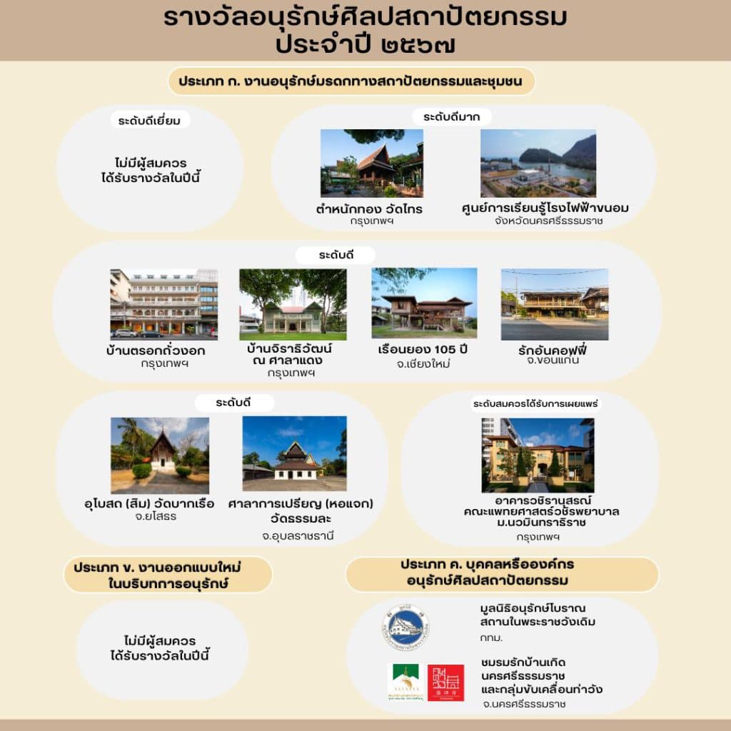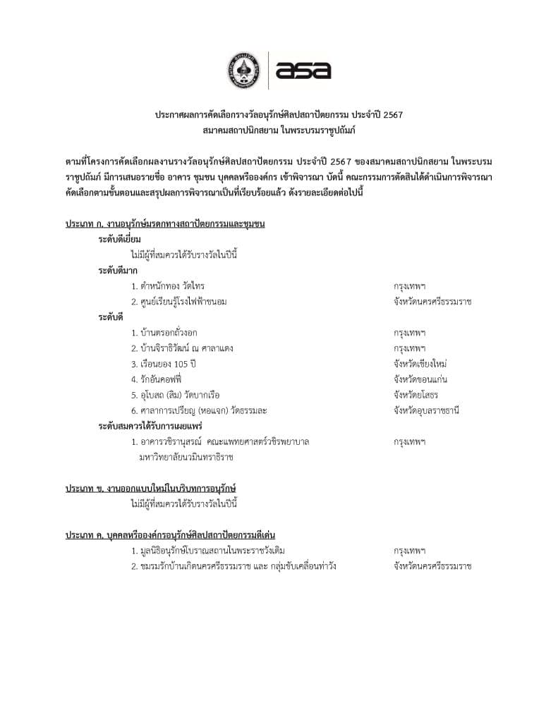 ประกาศผลการคัดเลือกรางวัลอนุรักษ์ศิลปสถาปัตยกรรม ประจำปี 2567