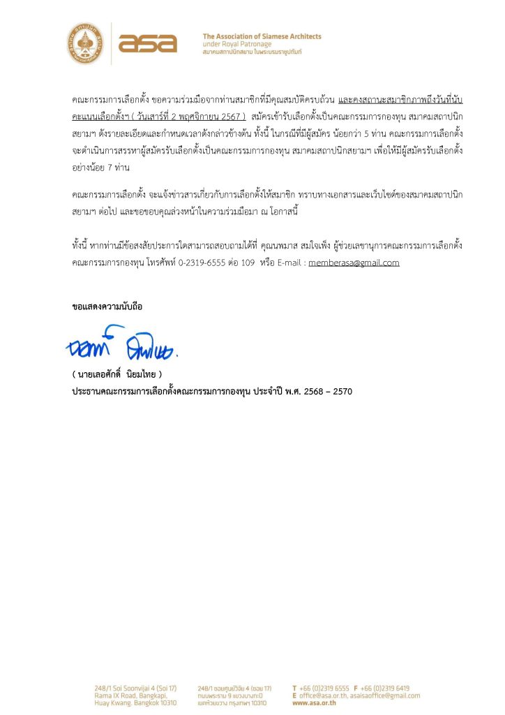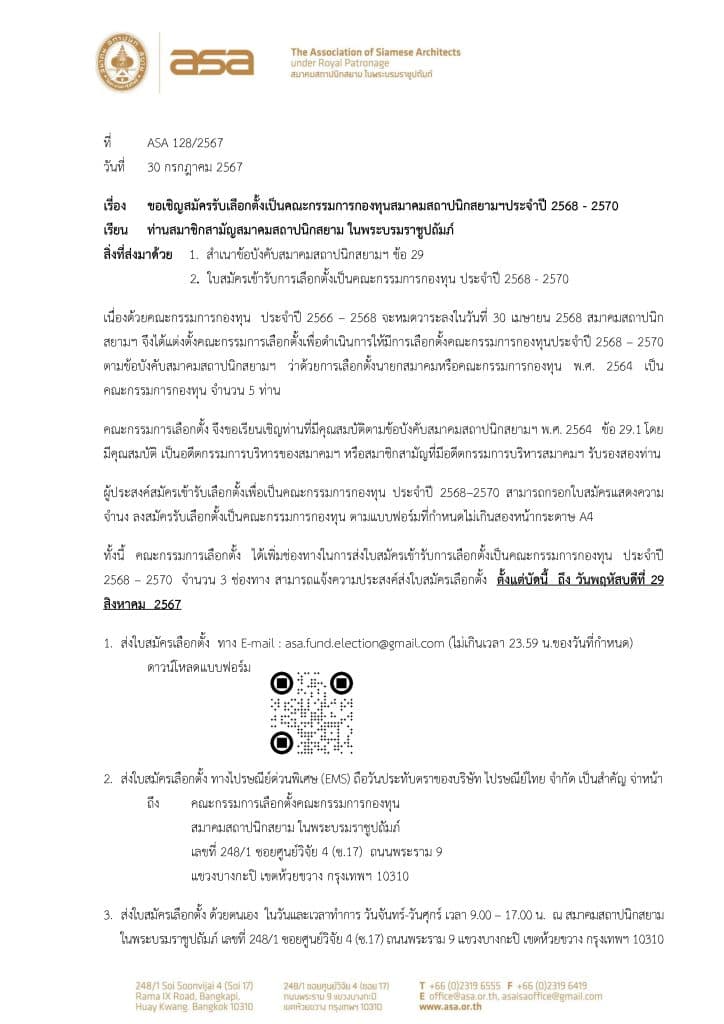 Home » News » ขอเชิญสมัครรับเลือกตั้งเป็นคณะกรรมการกองทุน สมาคมสถาปนิกสยาม ในพระบรมราชูปถัมภ์ ประจำปี 2568-2570