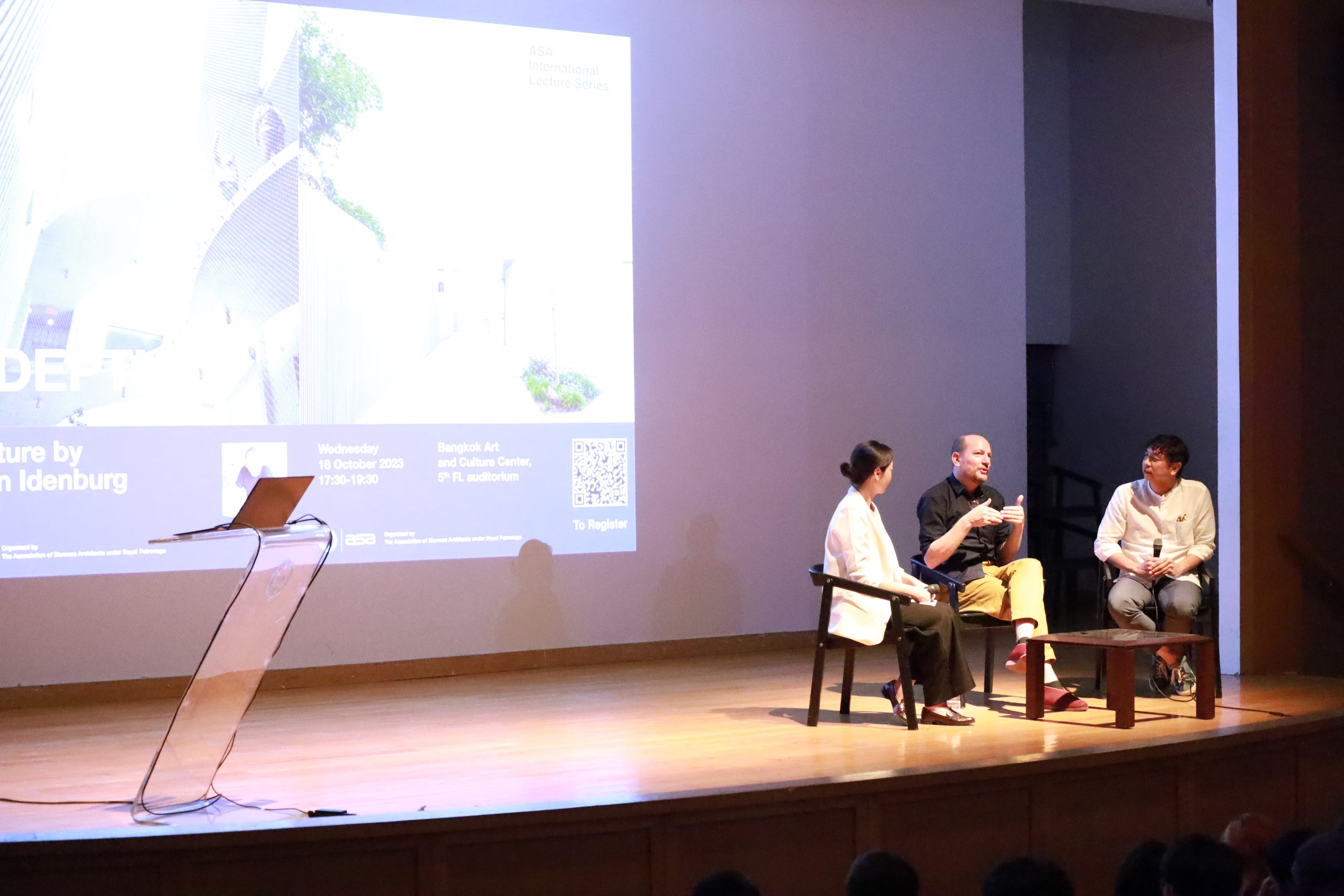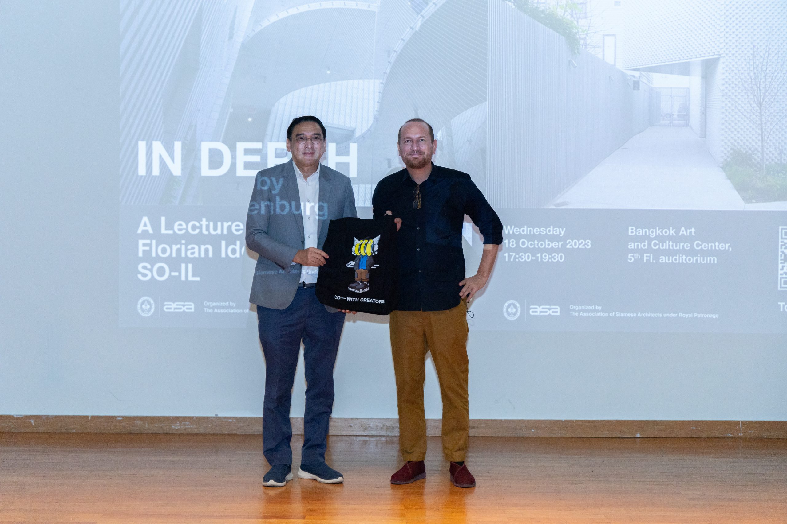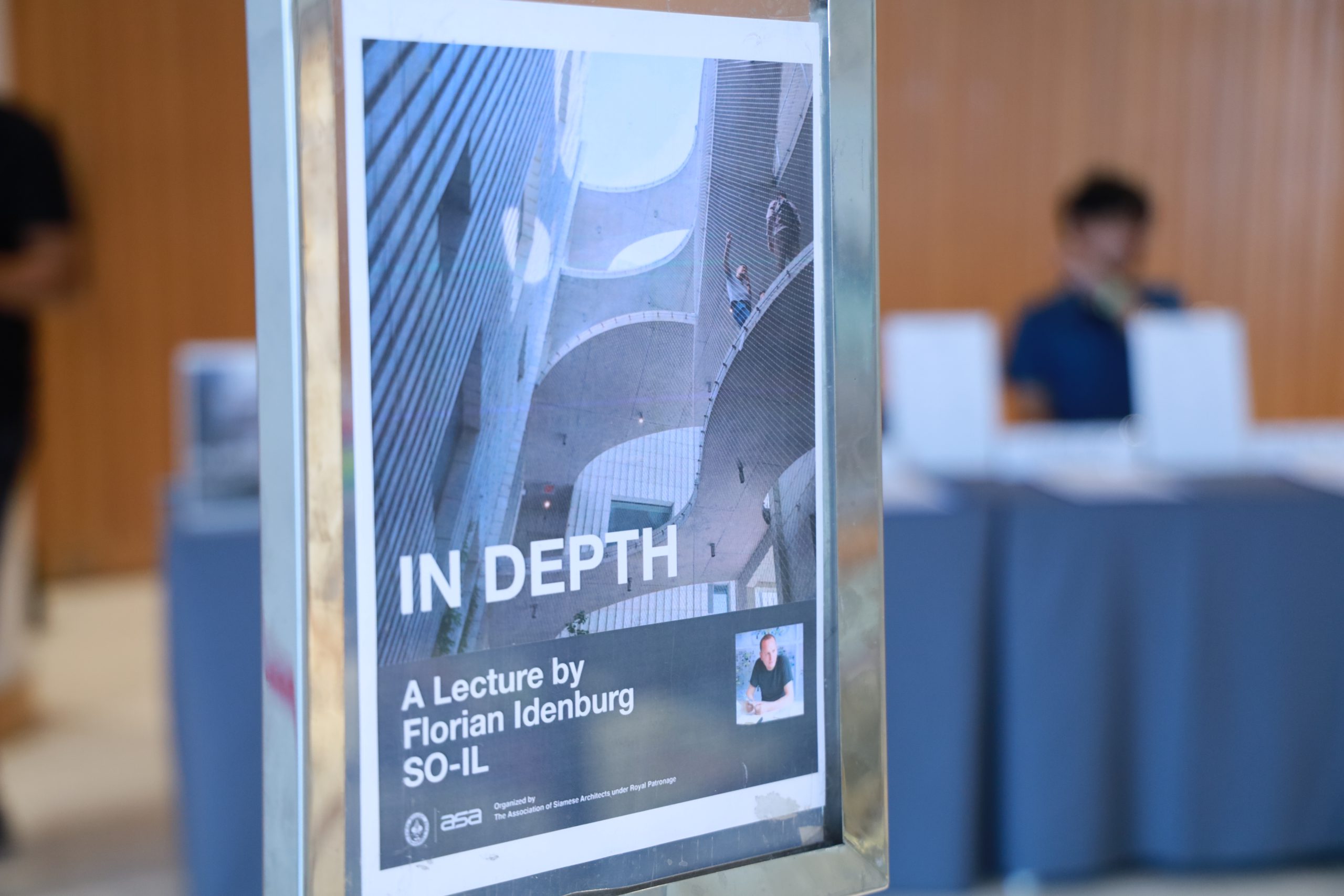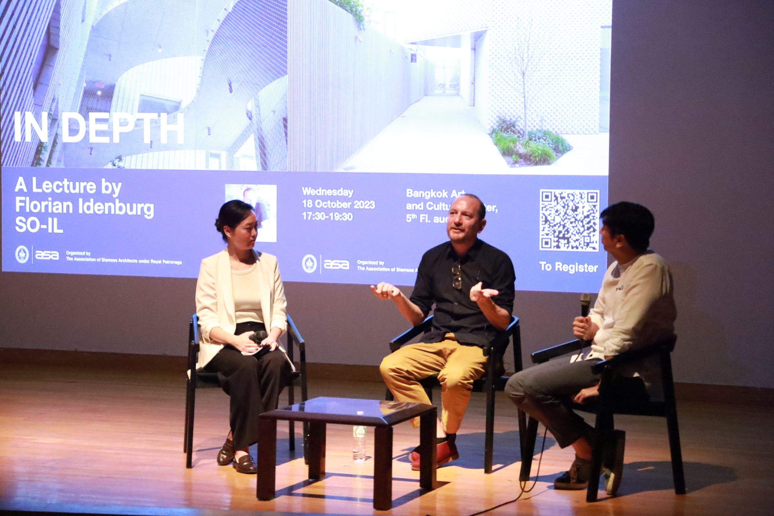 เมื่อวันพุธที่ 18 ตุลาคม 2566 สมาคมสถาปนิกสยาม ในพระบรมราชูปถัมภ์ จัดงานบรรยาย ASA International Lecture Series 2023 ครั้งที่ 02 ในหัวข้อ “In Depth” ณ ห้องออดิทอเรี่ยมชั้น 5 หอศิลปวัฒนธรรมแห่งกรุงเทพมหานคร ได้รับเกียรติจากคุณ Florian Idenburg สถาปนิกชื่อดังจาก SO-IL ประเทศสหรัฐอเมริกา เป็นวิทยากรบรรยายถึงงานออกแบบสถาปัตยกรรมที่มีชื่อเสียงระดับโลกและแนวคิดการทำงาน ที่ช่วยเสริมสร้างองค์ความรู้และแรงบันดาลใจ พร้อมกับเปิดโอกาสให้ผู้ฟังได้ซักถามอย่างเป็นกันเอง โดยมีคุณฉัตรพงษ์ ชื่นฤดีมล และ ดร. ศุภาศัย วงศ์กุลพิศาล ร่วมเป็นผู้ดำเนินรายการ งานครั้งนี้ได้มี นิสิต-นักศึกษา สถาปนิก และผู้สนใจเข้าร่วมรับฟังเป็นจำนวนมาก