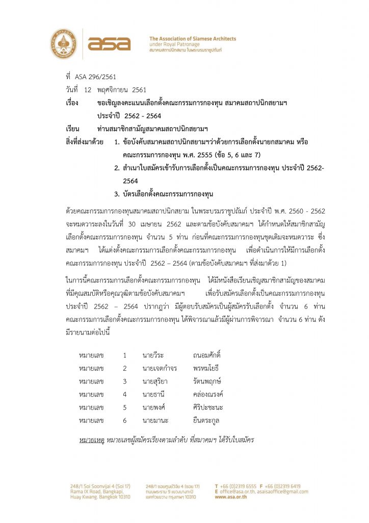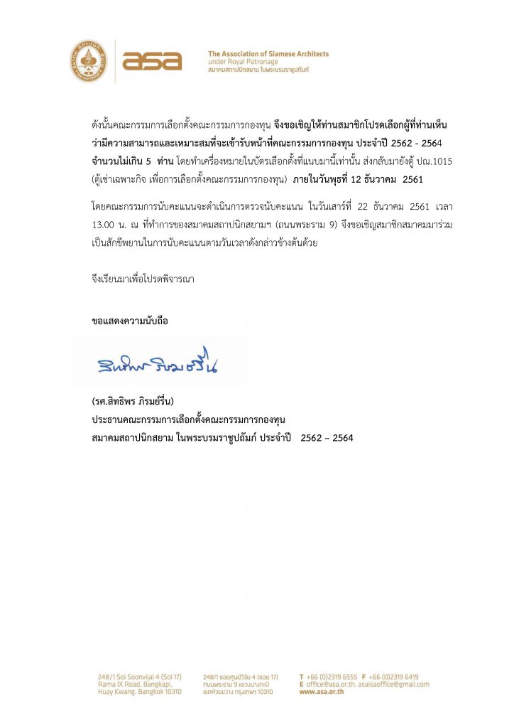 ขอเชิญลงคะแนนเลือกต้ังคณะกรรมการกองทุน สมาคมสถาปนิกสยามฯ ประจำปี 2562-2564