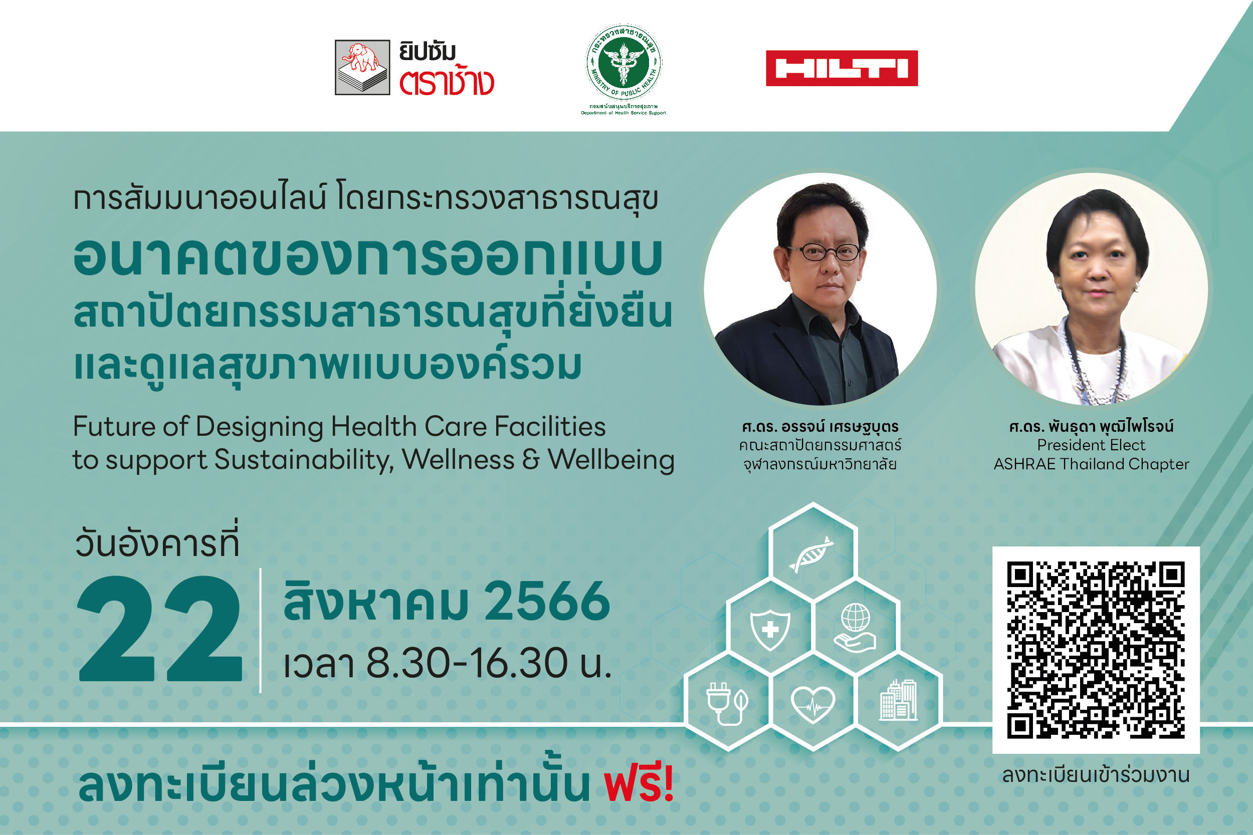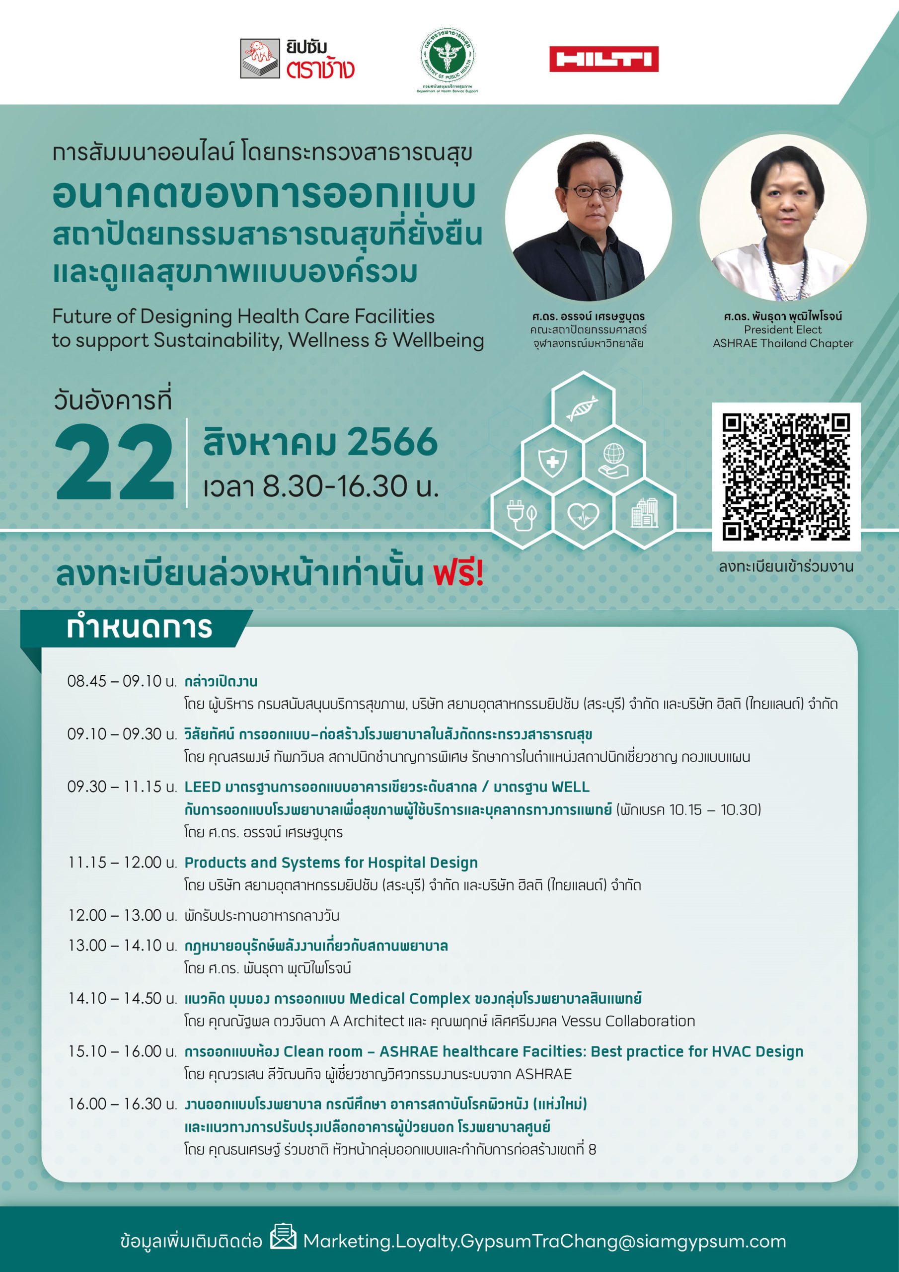 บริษัท สยามอุตสาหกรรมยิปซัม (สระบุรี) จำกัด ร่วมกับกระทรวงสาธารณสุขจัดงานสัมมนาเชิงวิชาการ “อนาคตของการออกแบบสถาปัตยกรรมสาธารณสุขที่ยั่งยืนและดูแลสุขภาพแบบองค์รวม”ที่กระทรวงสาธารณสุข ให้กับกลุ่มสถาปนิก วิศวกร บุคลากรของกระทรวงสาธารณสุข และเปิดให้เข้าฟังออนไลน์โดยมุ่งเน้นการออกแบบให้สอดคล้องกับมาตรฐานต่างๆ และกฎหมายที่เกี่ยวข้อง เพื่อส่งเสริมและพัฒนาการออกแบบก่อสร้างอาคารด้านสาธารณสุขให้สอดคล้องกับแนวทางการพัฒนาอย่างยั่งยืนบริษัทเห็นว่าการจัดสัมมนาครั้งนี้จะมีประโยชน์กับสมาชิกของสมาคมสถาปนิกฯ จึงขอความอนุเคราะห์ประชาสัมพันธ์กิจกรรมที่จะจัดผ่าน Webex  ในวันอังคารที่ 22 ส.ค. 66 เวลา 08.30-16.30 น.