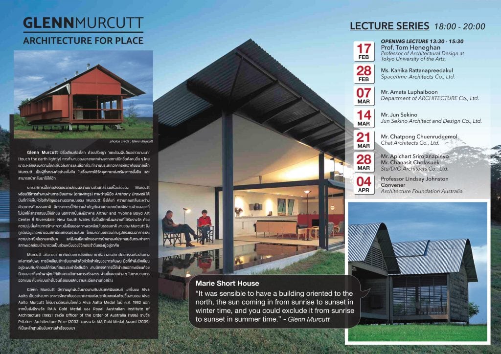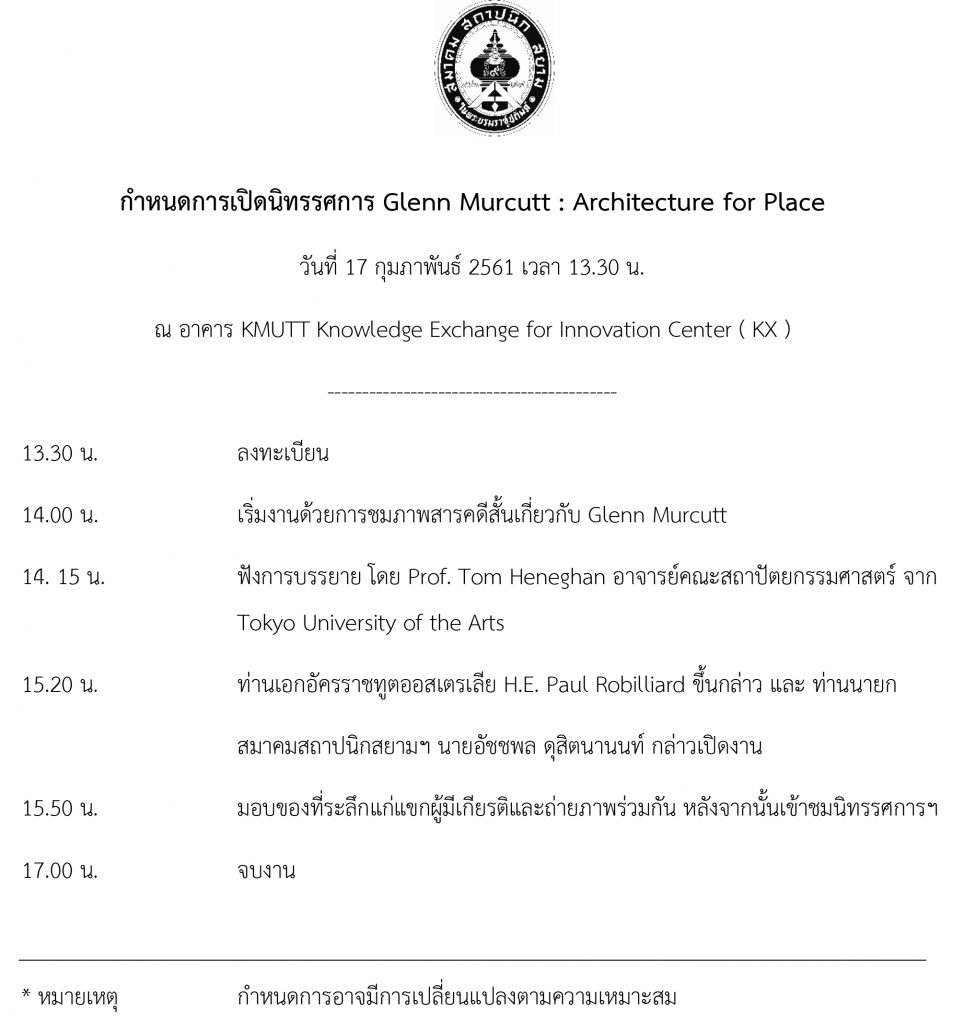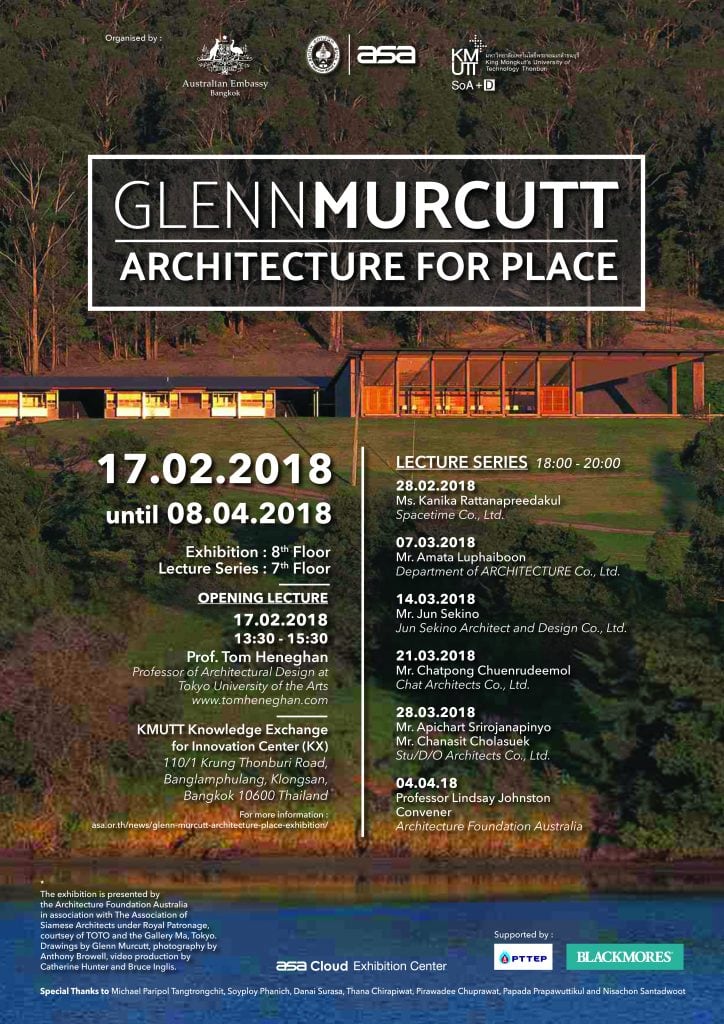 นิทรรศการ Glenn Murcutt : Architecture for Place จัดแสดงระหว่างวันที่ 17 กุมภาพันธ์ – 8 เมษายน 2561 ณ อาคาร KMUTT Knowledge Exchange for Innovation Center (KX) ชั้น 8
