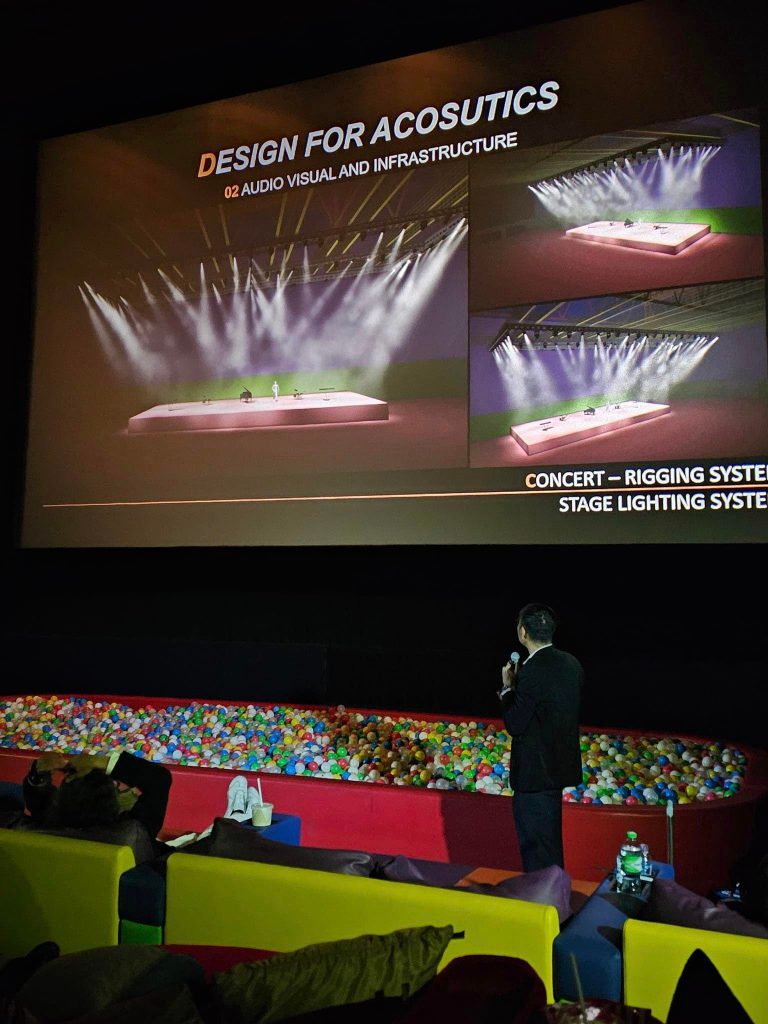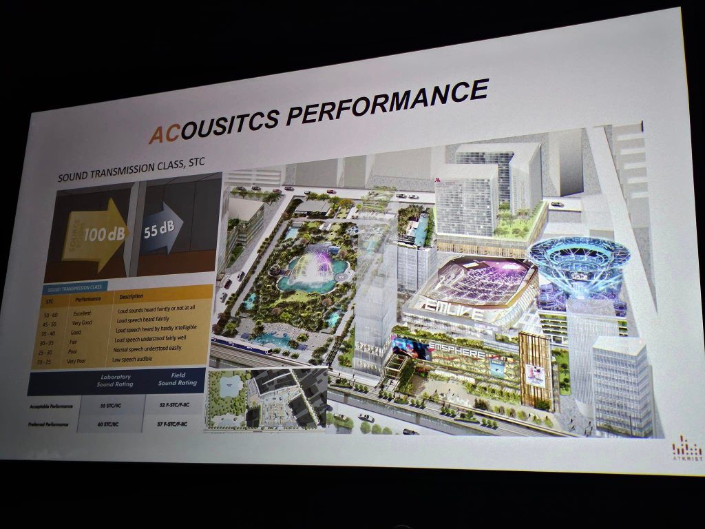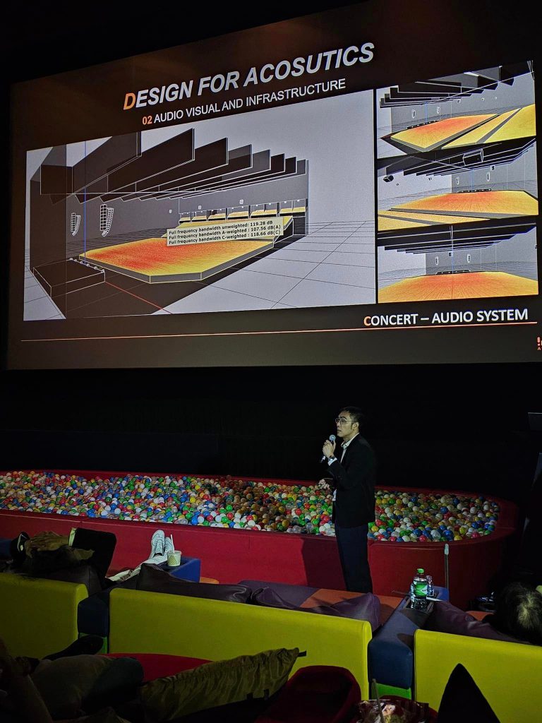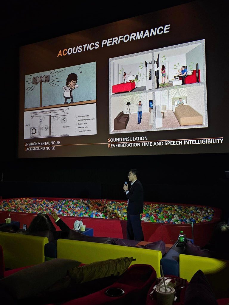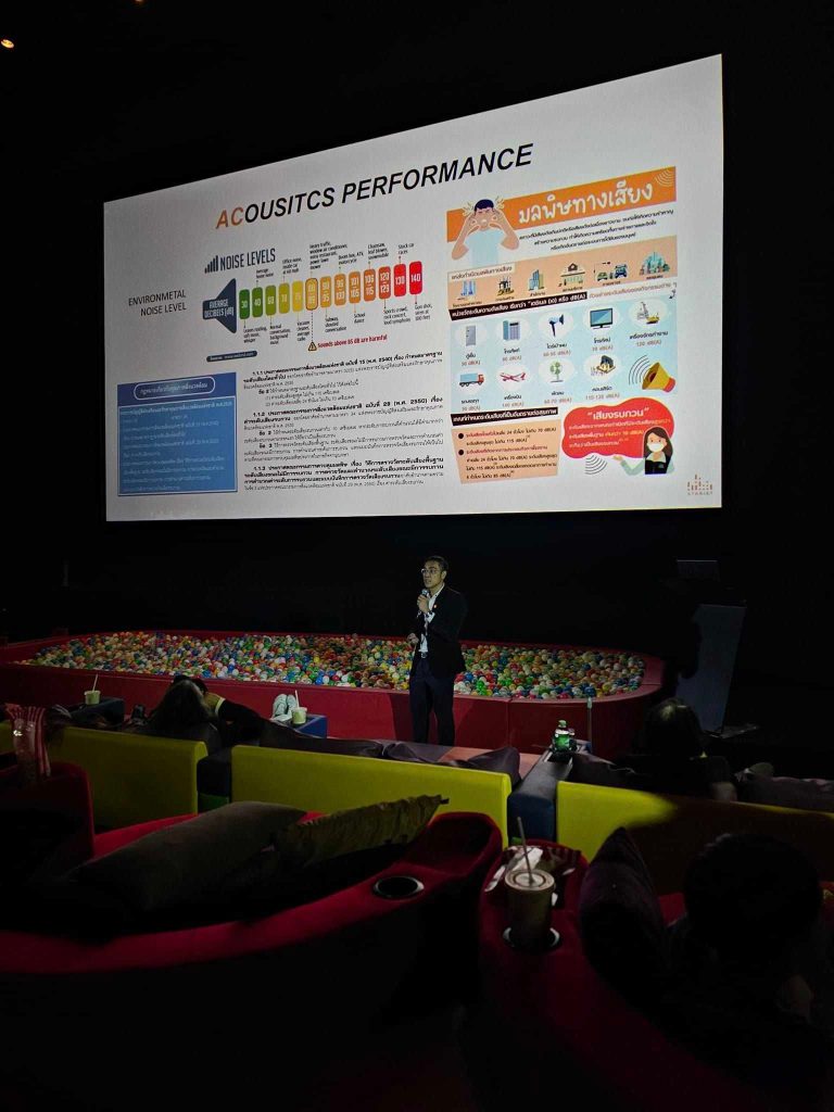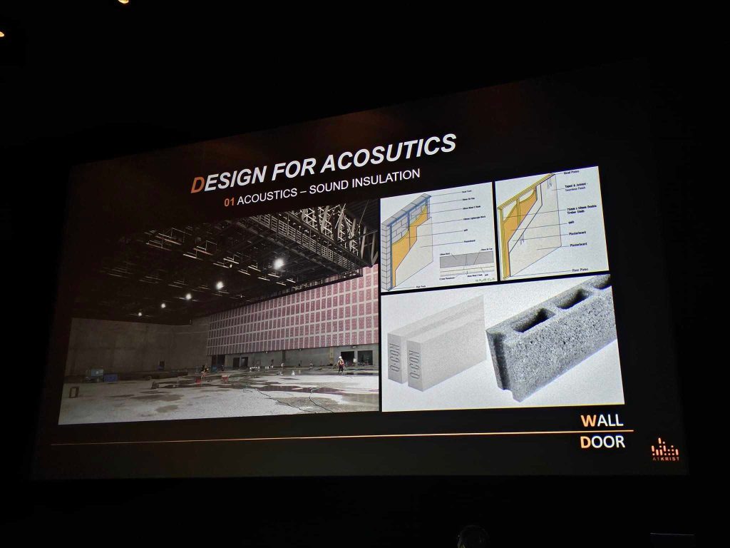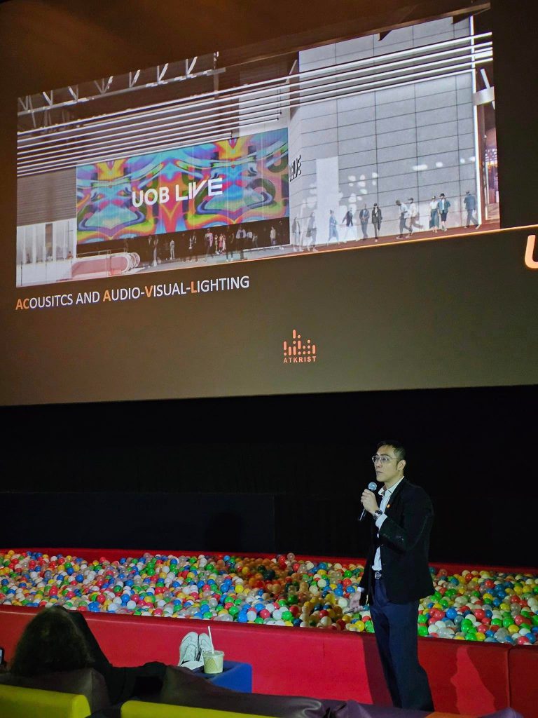 ดร. กฤษฎา วิวัฒน์เวคิน จาก Atkrist Co.,Ltd ผู้เชี่ยวชาญด้าน Acoustics ของโครงการ ที่มาเล่าเรื่องราวของการออกแบบเสียง การควบคุมเสียงของ UOB Live(EM-LIVE) ที่จะเป็น Hall ระดับ World Class พื้นที่ใช้จัดงานขนาดใหญ่ มีความจุ 6,000 ที่นั่ง ตั้งอยู่ที่ชั้น 8 ของอาคาร ซึ่งเป็น Hall ขนาดใหญ่ 4,000 ตารางเมตร ที่มีการใช้งานหลากหลาย และยืดหยุ่น ตั้งแต่การจัดคอน Concert ศิลปินระดับโลก ไปจนถึงงาน International Fair และทันสมัยมาก ของโครงการ The Emsphere ฟังเพลิน เข้าใจง่ายมาก ทั้งเรื่อง Acoustics Performance การ Design for Acoustics (Sound Insulation, Sound Absorption, Air Conditionning system Noise Centeria, Audio Visual and Infrastructure) และน่าจะเป็นประโยชน์กับทุกคนที่ได้ฟัง ทั้งเรื่องเทคนิคต่างๆ ที่เกี่ยวกับเสียง ค่าต่างๆที่เป็น parametric กราฟ และวัสดุต่างๆที่ผ่านการศึกษา ก่อนนำมาใช้ออกแบบและติดตั้ง รวมถึงเทคนิคต่างๆ ด้วย