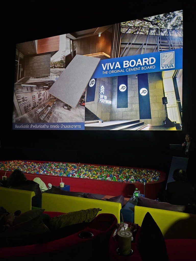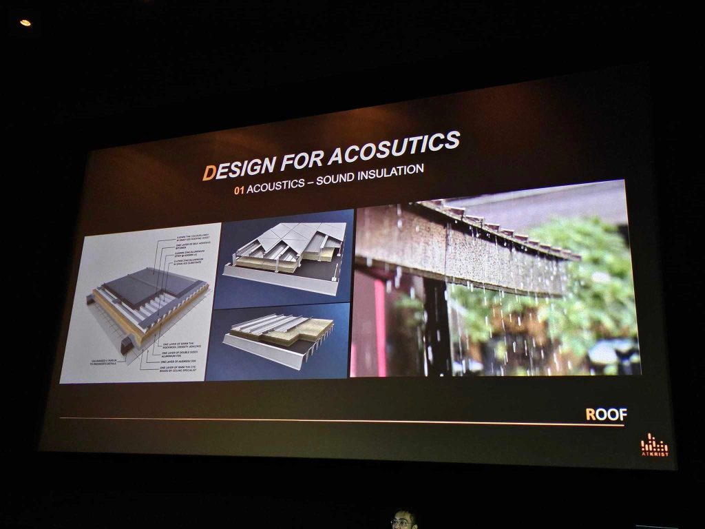 คุณจตุพล กุศลใบบุญ จาก บริษัท วิบูลย์วัฒนอุตสาหกรรม จำกัด เล่าถึง ที่มาและคุณสมบัติของแผ่น Wood Cement Bord ที่เอามาใช้ในส่วนของ งาน Acoustic ของ UOB Live (EM-LIVE) ที่อยู่ใต้หลังคาของห้อง ที่ทำให้เป็นหลังคาที่ป้องกันเสียง และกันความร้อนได