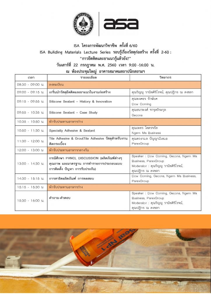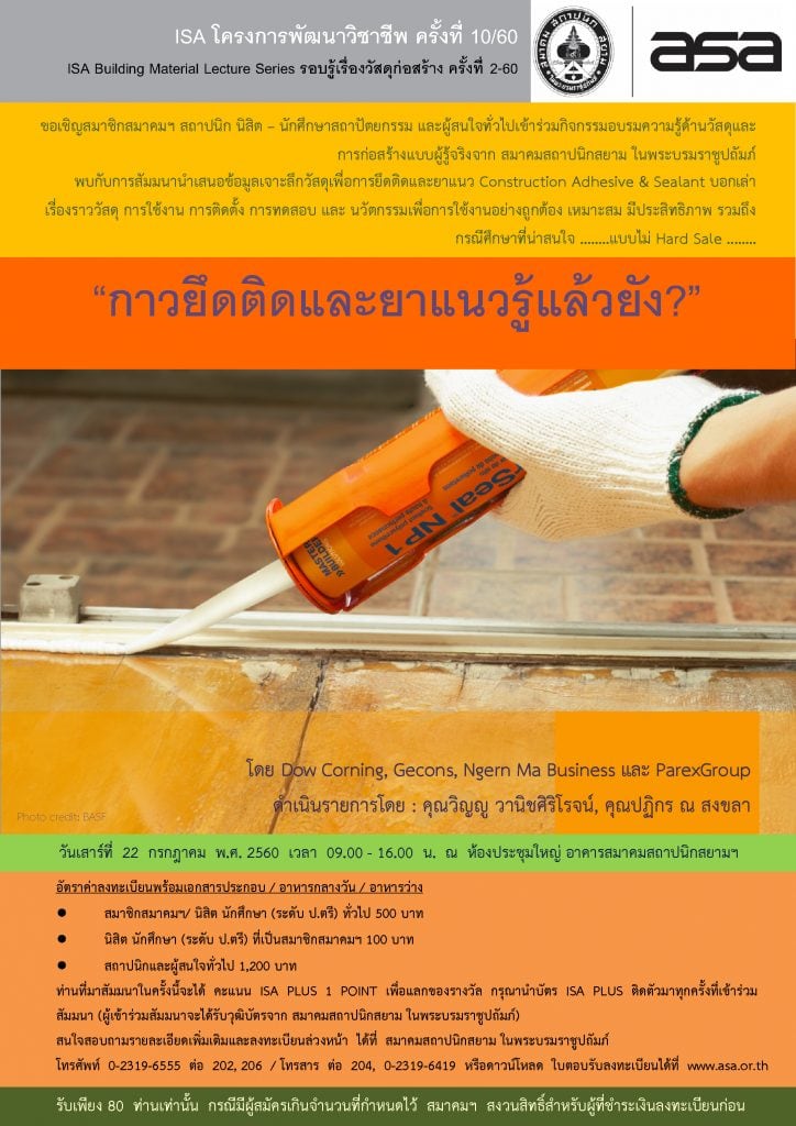 ขอเชิญสมาชิกสมาคมฯ สถาปนิก นิสิต – นักศึกษาสถาปัตยกรรม และผู้สนใจทั่วไปเข้าร่วมกิจกรรมอบรมความรู้ด้านวัสดุและการก่อสร้างแบบผู้รู้จริงจาก สมาคมสถาปนิกสยาม ในพระบรมราชูปถัมภ์ พบกับการสัมมนานำเสนอข้อมูลเจาะลึกวัสดุเพื่อการยึดติดและยาแนว Construction Adhesive & Sealant บอกเล่าเรื่องราววัสดุ การใช้งาน การติดตั้ง การทดสอบ และ นวัตกรรมเพื่อการใช้งานอย่างถูกต้อง เหมาะสม มีประสิทธิภาพ รวมถึงกรณีศึกษาที่น่าสนใจ ……..แบบไม่ Hard Sale ……..