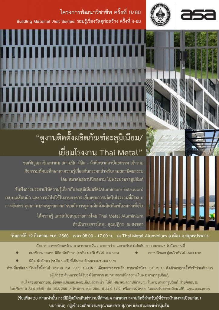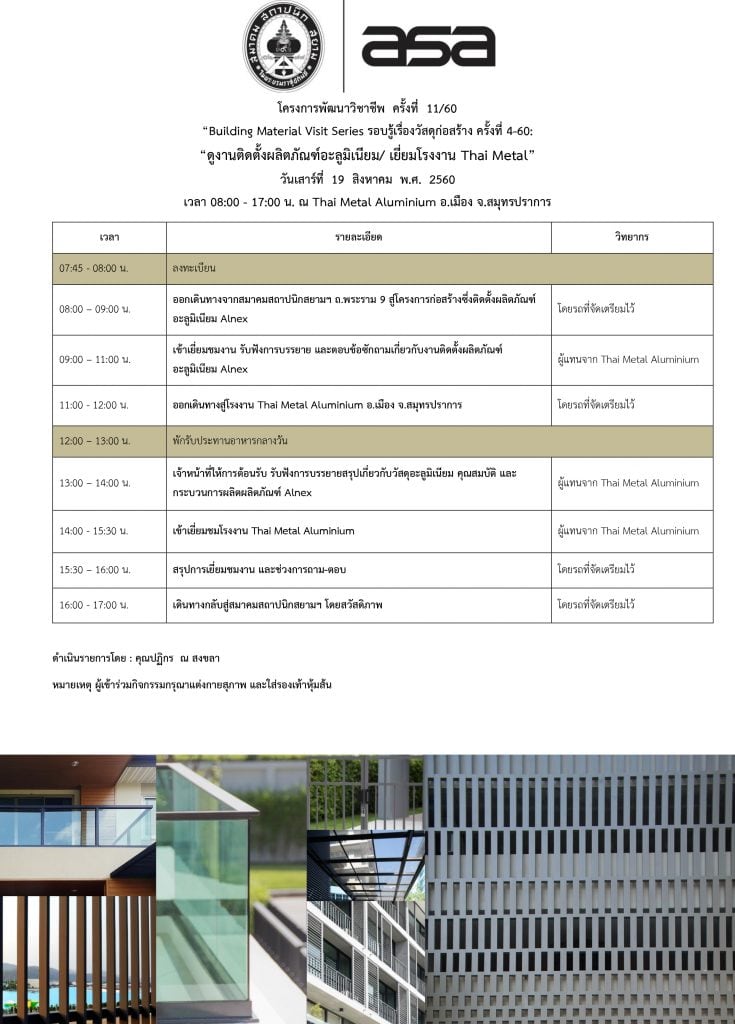 (ปิดรับสมัคร) 19 ส.ค. 60 | โครงการพัฒนาวิชาชีพ ครั้งที่ 11/60 “ดูงานติดตั้งผลิตภัณฑ์อะลูมิเนียม / เยี่ยมโรงงาน Thai Metal”