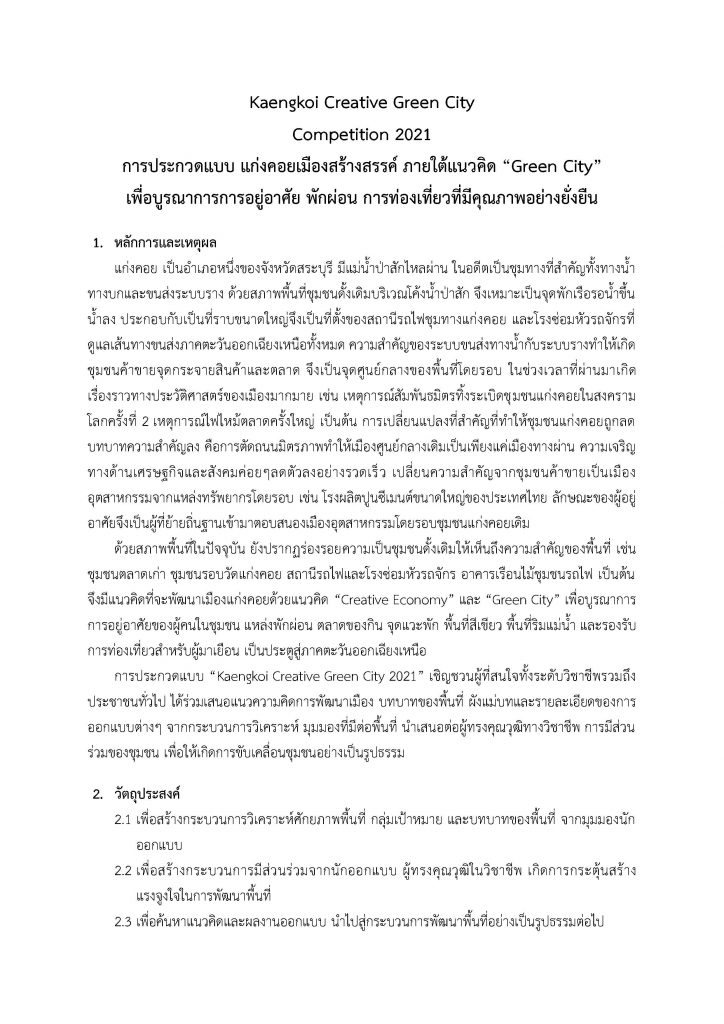 ประกาศผลการคัดเลือก Kaengkoi Creative Green City Competition 2021 การประกวดแบบ แก่งคอยเมืองสร้างสรรค์ ภายใต้แนวคิด “Green City” รอบที่ 1
