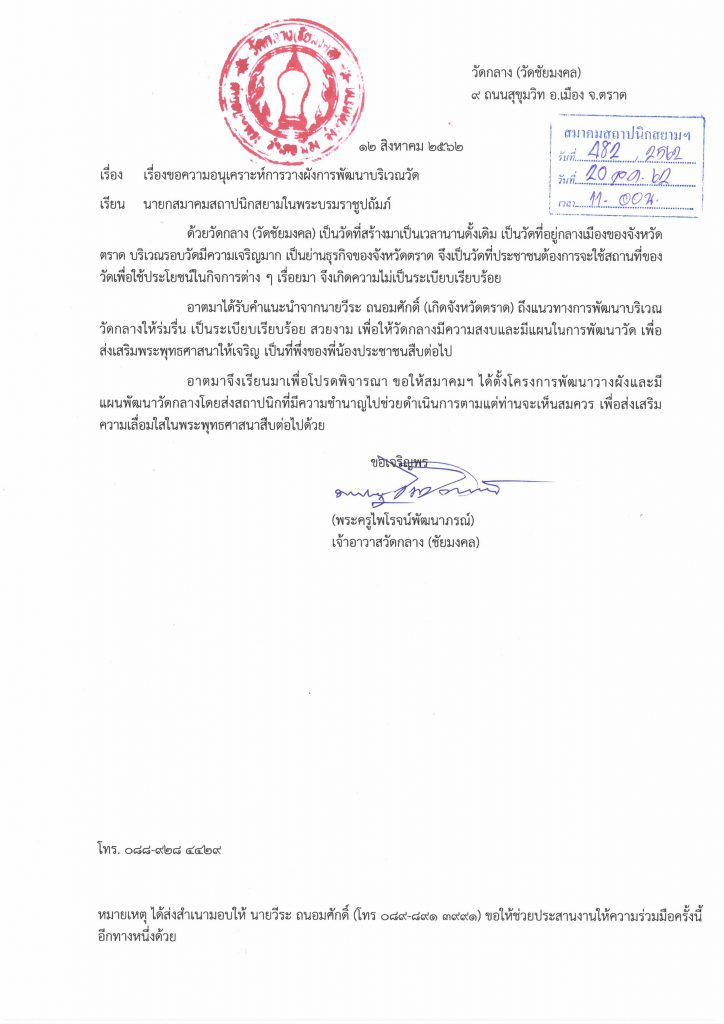 ตามที่พระครูไพโรจน์พัฒนาภรณ์ เจ้าอาวาสวัดกลาง (วัดชัยมงคล) จ.ตราด ส่งเรื่องถึงสมาคมสถาปนิกสยาม ในพระบรมราชูปถัมภ์ เพื่อขอความอนุเคราะห์สถาปนิกช่วยเหลือโครงการวางผังและพัฒนาบริเวณวัด ตามเอกสารแนบนั้น สมาคมฯพิจารณาแล้วว่า เห็นควรให้ประชาสัมพันธ์ผ่านสื่อของสมาคมฯ เพื่อให้สมาชิกและสถาปนิกผู้ที่มีจิตอาสา ได้ทราบข่าวไปในวงกว้าง เพื่อช่วยกันระดมกำลังเข้ามาช่วยเหลือโครงการฯ ตามความเชี่ยวชาญ สถาปนิกจิตอาสาท่านใดสนใจช่วยเหลือ สามารถติดต่อที่พระครูไพโรจน์พัฒนาภรณ์ โทร. 088-928-4429