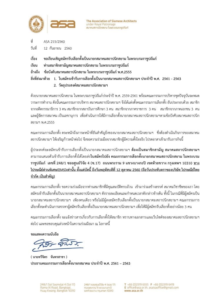 เรียนเชิญสมัครรับเลือกตั้ง นายกสมาคมสถาปนิกสยาม ในพระบรมราชูปถัมภ์ ประจำปี 2561-2563