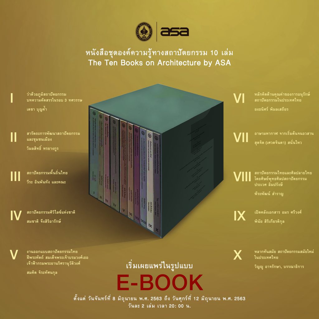 The Ten Books on Architecture by ASA ที่จัดทำขึ้นในรูปเล่มขนาด 10 นิ้ว x 10 นิ้วและเผยแพร่ในรูปแบบ e-book นี้ เป็นการรวบรวมผลงานการศึกษาสถาปัตยกรรมในสาขาวิชาต่าง ๆ ให้แก่ผู้ที่สนใจทั้งในและนอกวงการสถาปัตยกรรมได้อ่านและค้นคว้าอย่างแพร่หลายโดยไม่คิดมูลค่า ประกอบด้วยหนังสือทรงคุณค่าดังต่อไปนี้