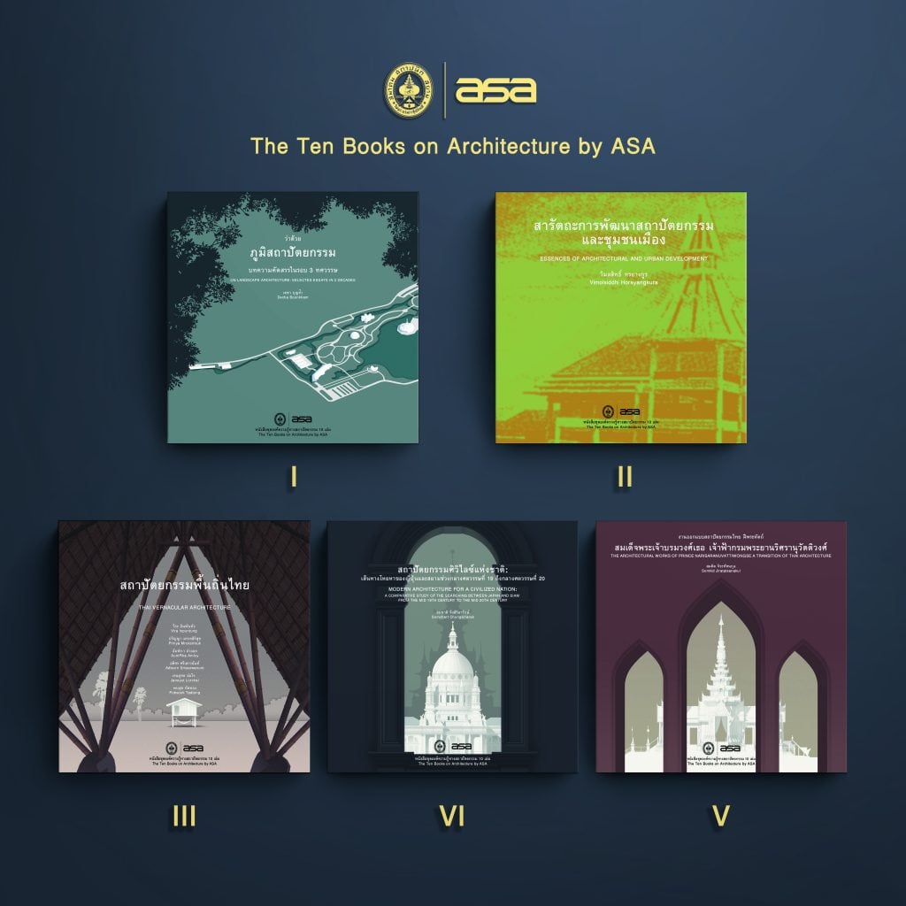 The Ten Books on Architecture by ASA ที่จัดทำขึ้นในรูปเล่มขนาด 10 นิ้ว x 10 นิ้วและเผยแพร่ในรูปแบบ e-book นี้ เป็นการรวบรวมผลงานการศึกษาสถาปัตยกรรมในสาขาวิชาต่าง ๆ ให้แก่ผู้ที่สนใจทั้งในและนอกวงการสถาปัตยกรรมได้อ่านและค้นคว้าอย่างแพร่หลายโดยไม่คิดมูลค่า ประกอบด้วยหนังสือทรงคุณค่าดังต่อไปนี้