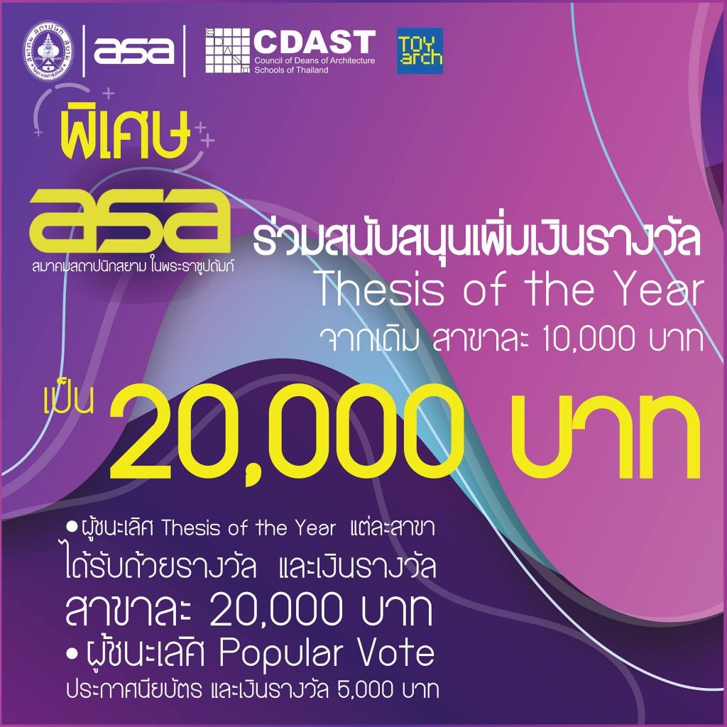 2 asa (สมาคมสถาปนิกสยาม ในพระราชูปถัมภ์)ร่วมสนับสนุนเพิ่มเงินรางวัล Thesis Of the Year จากเดิม สาขาละ 10,000.- เป็น 20,000.-